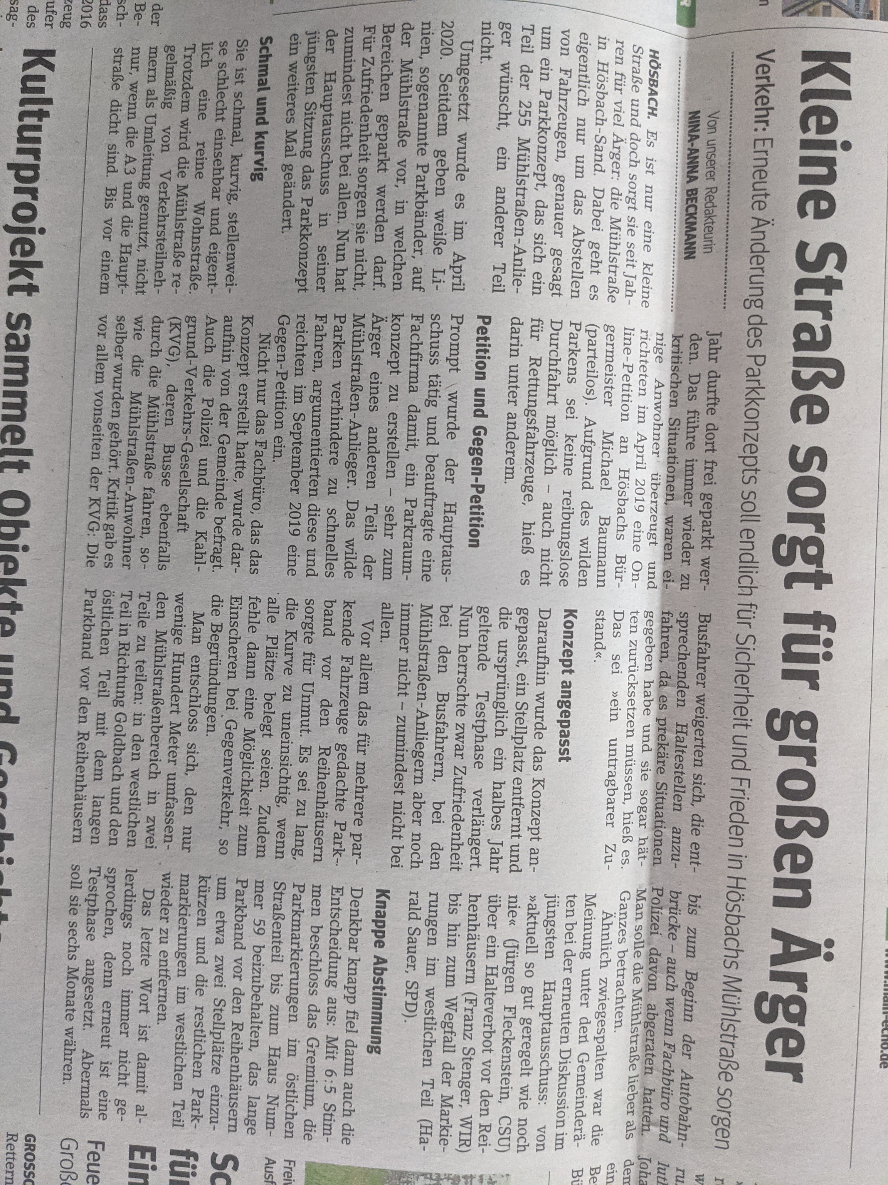 Die Parkbanden im westlichen Teil der Mühlstraße sollen nun wieder entfernt werden. Die Testphase wird erneut 6 Monate laufen.