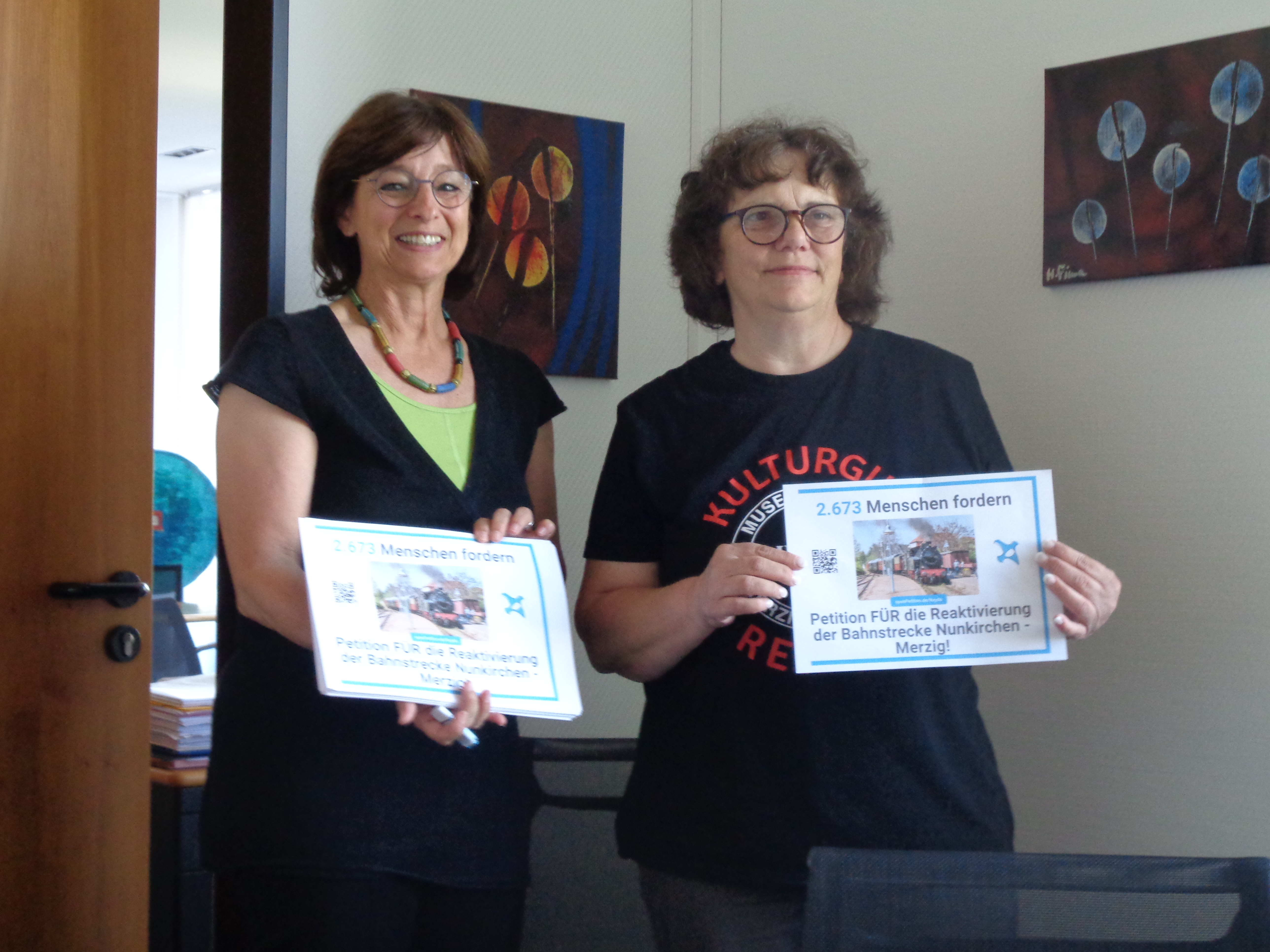 Heute ist es soweit, unsere Petition, "Für die Reaktivierung der Bahnstrecke Nunkirchen - Merzig", wird der Landrätin Daniela Schlegel - Friedrich überreicht. Wenn eine Petition einreicht wird, muss der Kreistag das zur Kenntnis nehmen und das Anliegen der Bürger zum Thema machen. Hier haben viele ihre Stimme erhoben und dafür danke ich euch allen. Ich bin fest davon überzeugt, dass die Meinung von so vielen Gewicht hat. Um dem noch mehr Nachdruck zu verleihen, sind heute am Freitag den 07.07.2023, alle die dabei sein möchten und können, herzlich dazu eingeladen, sich mit mir, um 11:30 Uhr, an der Rezeption vom Landratsamt Merzig zu treffen. Mit freundlichen Grüßen, Helga Mathilde Walther