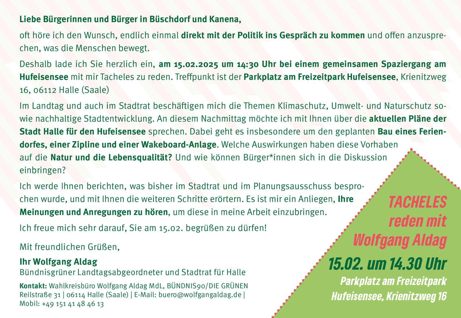 Am 15.02. 2025 wird sich Herr Wolfgang Aldag den Fragen der Bürgerinnen und Bürger zur Thematik "Hufeisensee und geplante Wakeboardanlage" stellen.