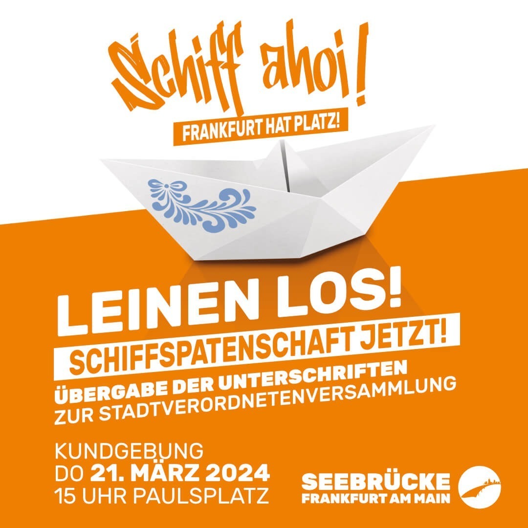 Die Seebrücke Frankfurt setzt sich mit der Kampagne "Schiff ahoi! Frankfurt hat Platz!" dafür ein, dass die Stadt eine Patenschaft für ein Schiff der zivilen Seenotrettung im Mittelmeer übernimmt. Im Rahmen der Kampagne haben viele Menschen diese Initiative mit ihrer Unterschrift unterstützt. Die gesammelten Unterschriften werden wir im Rahmen der Kundgebung an die Stadtverordnetenvorsteherin und an die inhaltlich zuständige Diversitäts- Dezernentin übergeben.