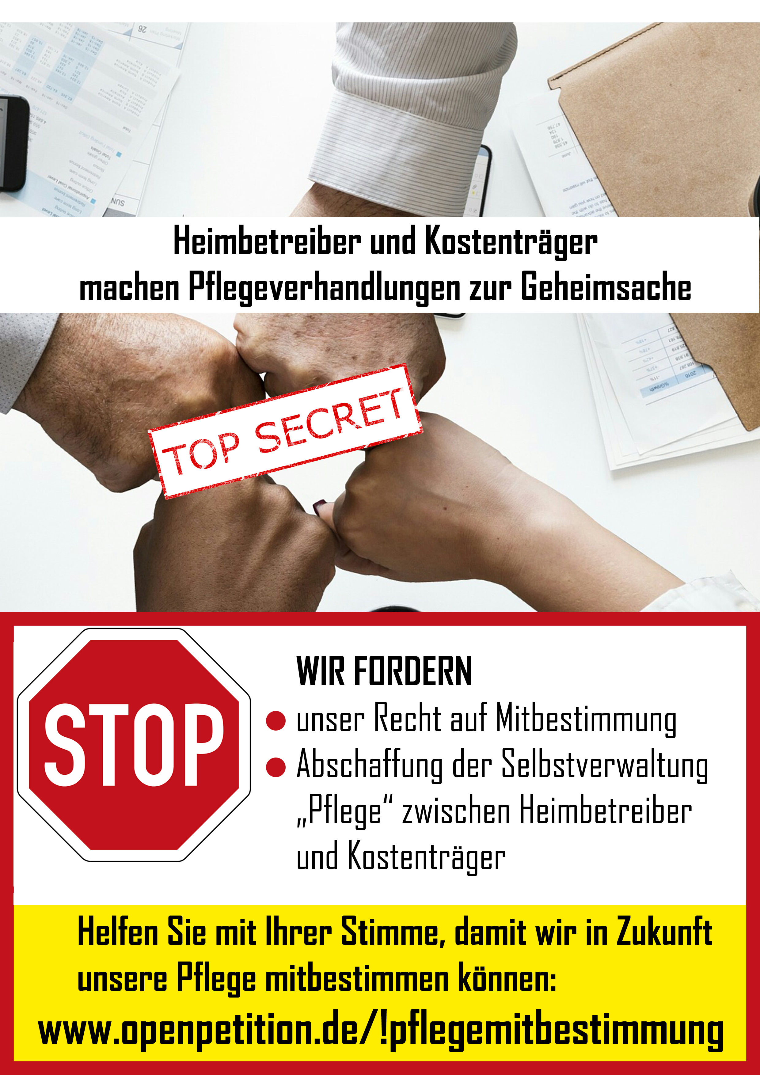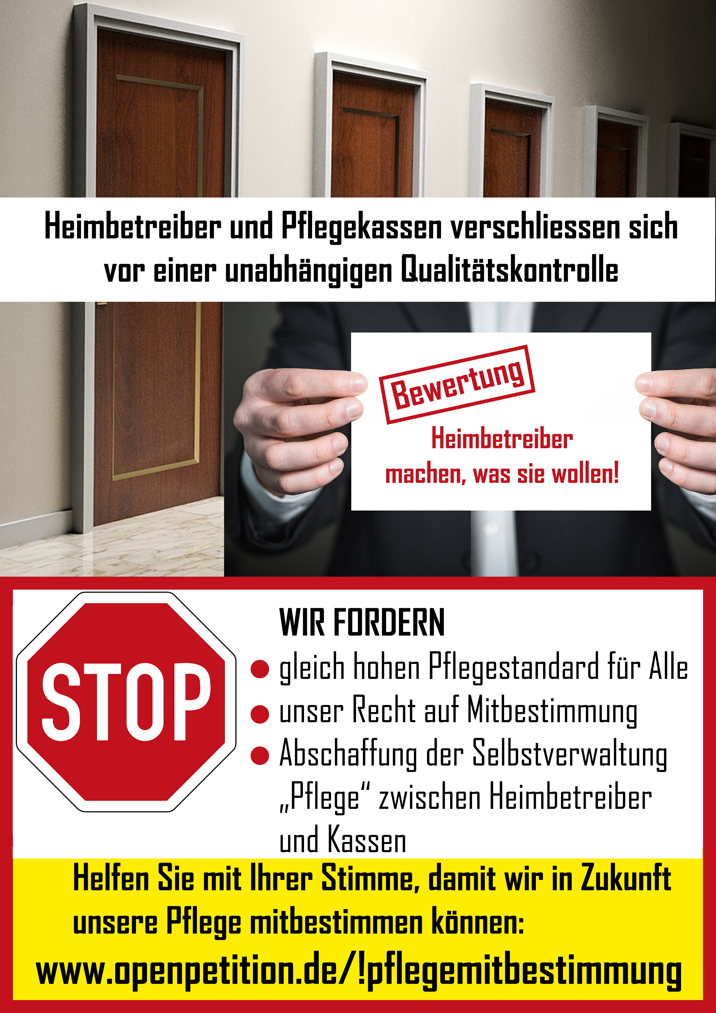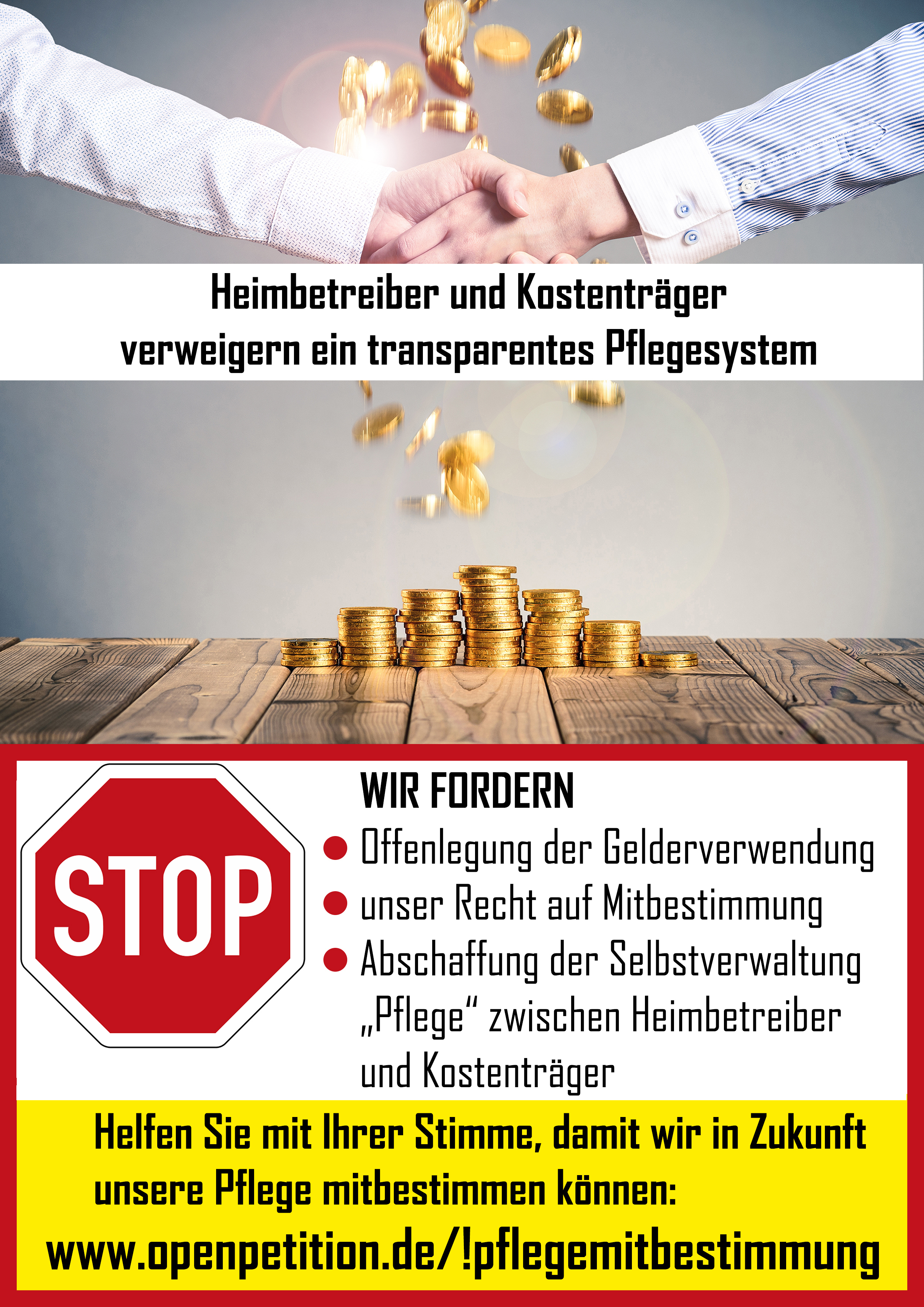 Neuer Petitionstext: Die Selbstverwaltung der Pflege in Deutschland muss uns Bürger ein Mitwirkungsrecht bei Verhandlungen und Abschlüssen Vereinbarungen einräumen! In Deutschland bestimmen Pflegekassen und Pflegeheimbetreiber zusammen!, zusammen, wie die Pflege in Heimen aussieht! Stillschweigeabkommen werden unterschrieben, damit nach Aussen keine Informationen über Verhandlungen bekannt werden. Wir Bürger erhalten keine Stimme! wir Wir Bürger haben kein Mitwirkungsrecht! 50/50 lautet die Stimmverteilung bei der Pflege Selbstverwaltung: 50% Pflegeheimbetreiber und 50% Pflegekassen. Somit geben Pflegeheimbetreiber sogar vor, wie die Qualitätskontrollen in Pflegeheimen auszusehen haben. Die bereitgestellten Gelder für die Pflege (vom Bund und Pflegebeiträge von uns Bürger) kommen nicht vollständig beim Pflegebedürftigen und den Pflegekräften in der Pflege an: Pflegeheimbetreiber schreiben seit Jahren schwarze Zahlen und hohe Renditen! Man gibt vor, Renditen, doch sie geben an, kein Geld für Pflegekräfte zu haben, Pflegebedürftige werden als Rendite Objekt gesehen. benutzt. Das Gesundheitsministerium sitzt aus und wartet auf Vorschläge von Pflegekassen und Pflegeheimbetreibern, die im Anschluss dann mal geprüft werden. Menschenwürdige werden?! Menschgerechte und würdevolle Pflege braucht klare Vorgaben und Auflagen von Seiten des Gesundheitsministeriums an vom Gesundheitsministerium AN Pflegekassen und Pflegeheimbetreiber! Menschenwürdige Pflege braucht ein Gesundheitsministerium, das Rückgrat hat! www.zdf.de/dokumentation/zdfzoom/zdfzoom-der-pflegestillstand-102.html
