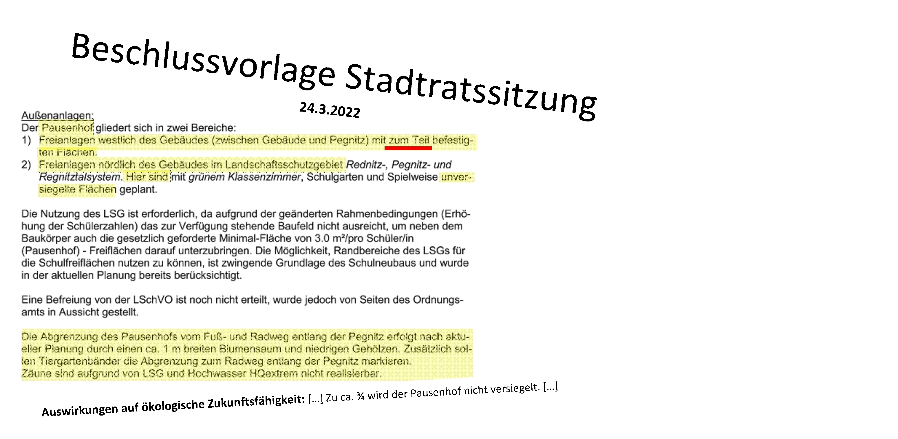 In der Beschlussvorlage (TOP16) zur Schulneubauplanung wird eine solche bauliche Absicherung erneut explizit abgelehnt, die Möglichkeit zur nachträglichen Sicherung nicht aufgeführt, obwohl von Bürgermeister Braun während der Bauausschusssitzung als Nachbesserungsmöglichkeit in Aussicht gestellt; der Pausenhof wird nur zum Teil befestigt, 75% sollen weiter unversiegelt bleiben: