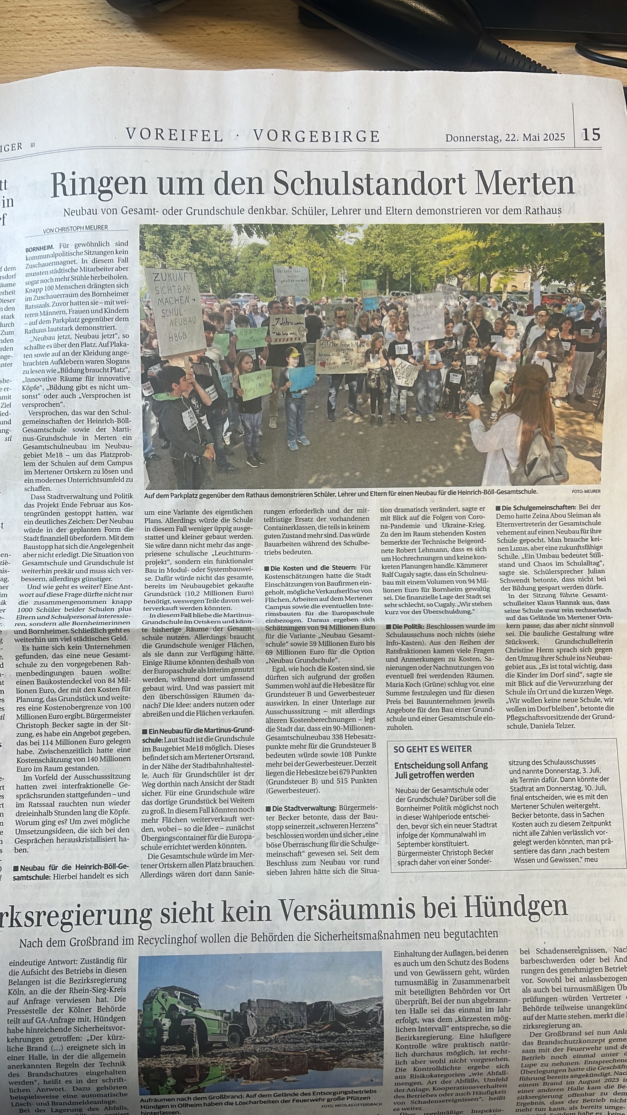 Unsere Aktionen sind noch nicht vorbei! Aufgrund unseres Protestes wurde die Entscheidung vertagt und es wird weiter diskutiert! Am 3.07.2025 wird die nächste Demo von uns vor der Sitzung am Bornheimer Rathaus stattfinden- die.Planung läuft. Wir freuen uns über jeden Unterstützenden!