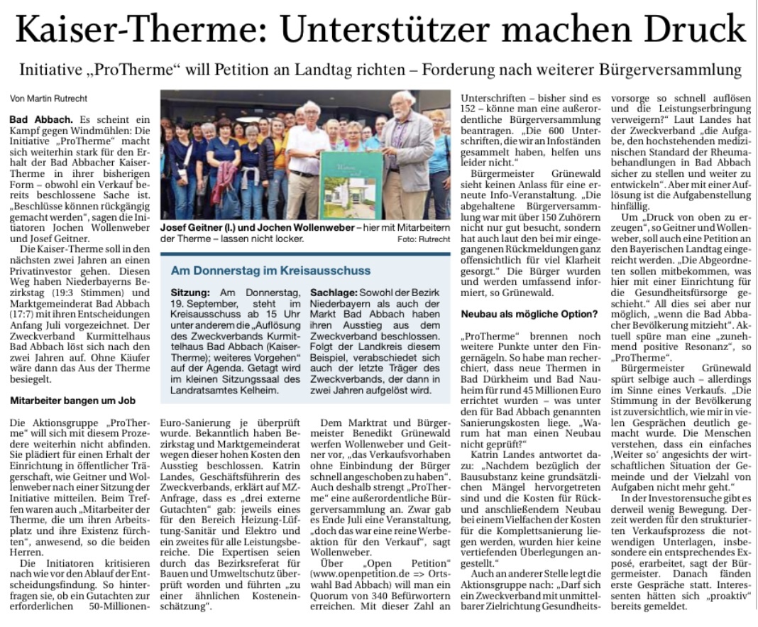 Von der inititiative kommt ein ehemaliger Bürgermeister,und eine politische Persönlichkeit, DIE EINBLICK INS BAD ABBACHER MARKTGESCHEHEN hat , und ich aus Regensburg. . Ein großzügigess Spendenangebot zur Finanzierung unser Aktion liegt bereits vor.
