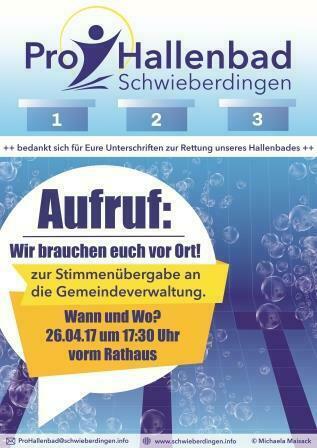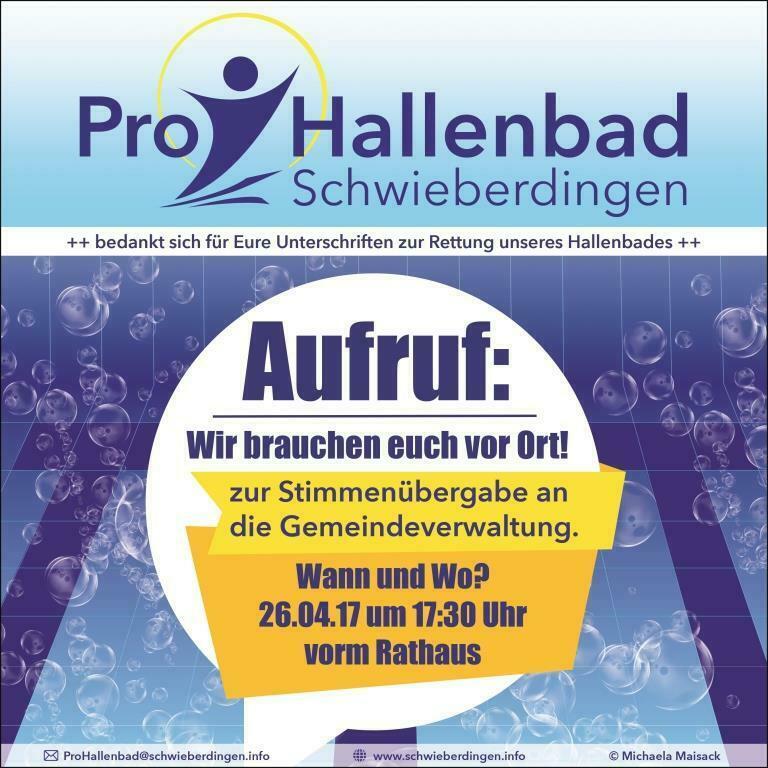 Nach den Osterferien am Mittwoch den 26.4.2017 um 17:30 überreichen wir Herr Lauxmann die Unterschriften. Eure Anwesenheit vorm Rathaus verstärkt und bekräftigt die Wichtigkeit von Schwimmbad und Sportstätten für Schwieberdinger Bürger. Gibt Eurem Anliegen ein Gesicht.