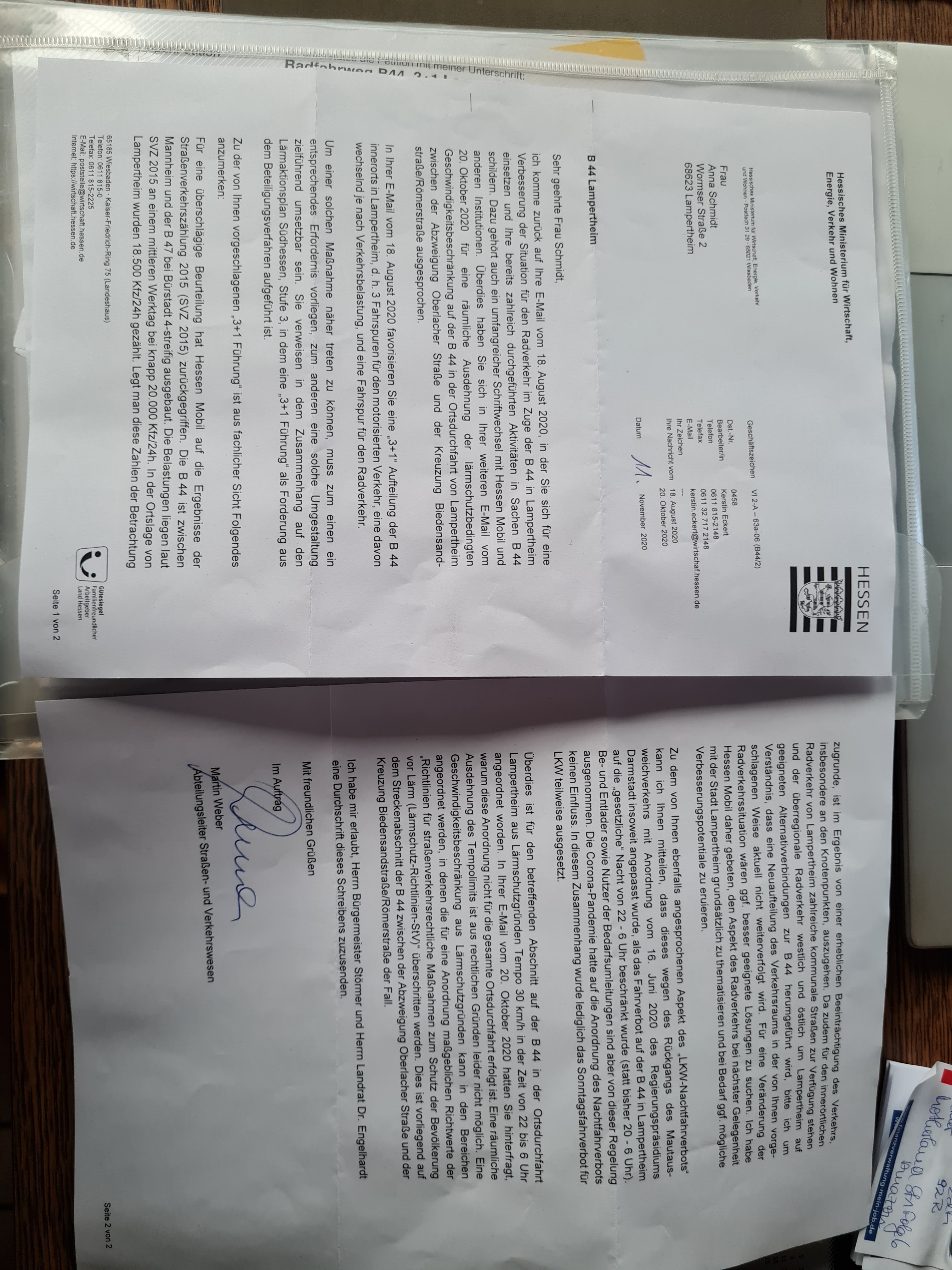 Als Abschluss der Petition sende/veröffentliche ich das Schreiben vom Hessischen Ministerium für Wirtschaft, Energie, Verkehr und Wohnen gezeichnet von Herrn Martin Weber /Abteilungsleiter Straßen- und Verkehrswesen.