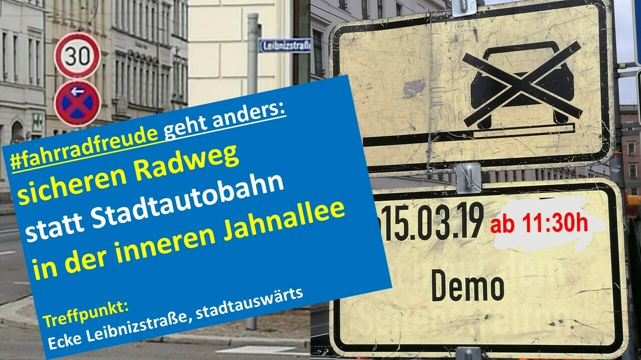 Am Freitag, 15.3. demonstrieren wir, der Ökolöwe - Umweltbund Leipzig e.V., der ADFC Leipzig e.V. und der BUND Leipzig, für sicheren Radverkehr in der inneren Jahnallee. Seit heute stehen Parkverbotsschilder und ist Tempo 30 angeordnet - aber der Radverkehr wurde mal wieder seitens der Straßenverkehrsbehörde vergessen. Darauf machen wir ab 11:30h aufmerksam.Treffpunkt ist Jahnallee/ Ecke Leibnizstraße, stadtauswärts.
