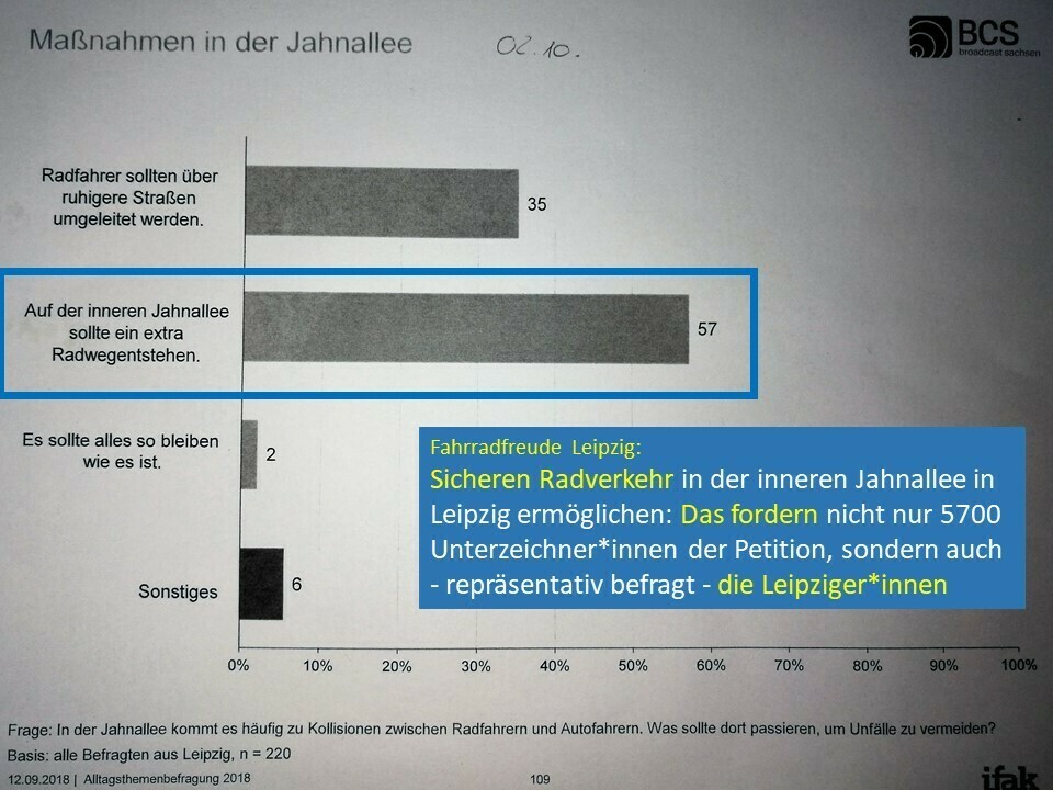 heute am 2.10.2018 berichtet Radio Leipzig, UKW-Frequenz 91,3, über eine repräsentative Umfrage unter allen Leipziger*innen: 57% wünschen sich demnach eine sichere Radverkehrsanlage in der inneren Jahnallee.