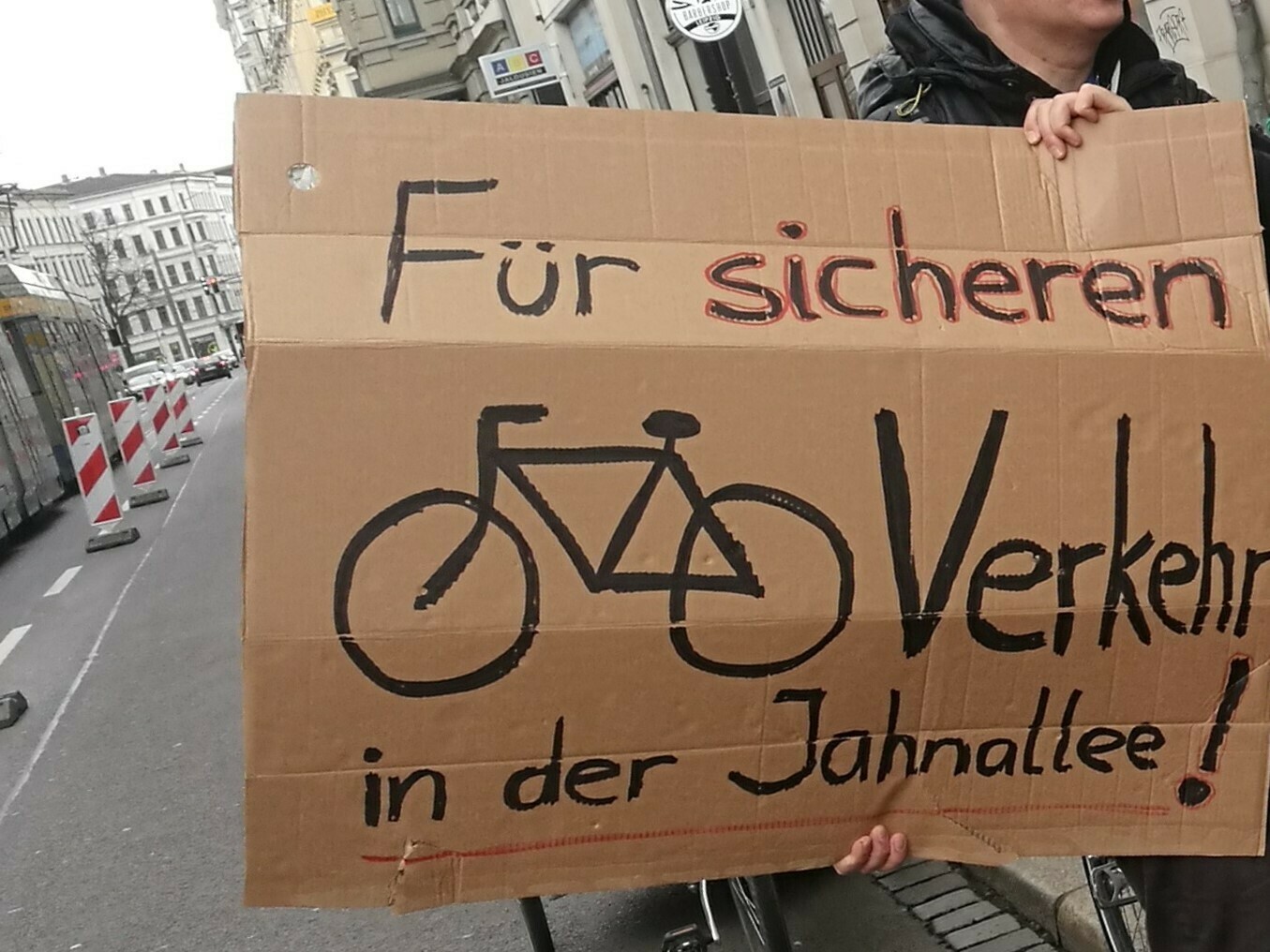 Es war geplant schon in dieser Woche Parkverbotsschilder in der inneren Jahnallee aufzustellen. Weil das Anliefern der Geschäfte aber weiterhin über den Straßenrand passieren sollte, wäre kein Platz für Radverkehrsanlagen gewesen. Aber dann wäre ja nichts gewonnen für uns Radler*innen.