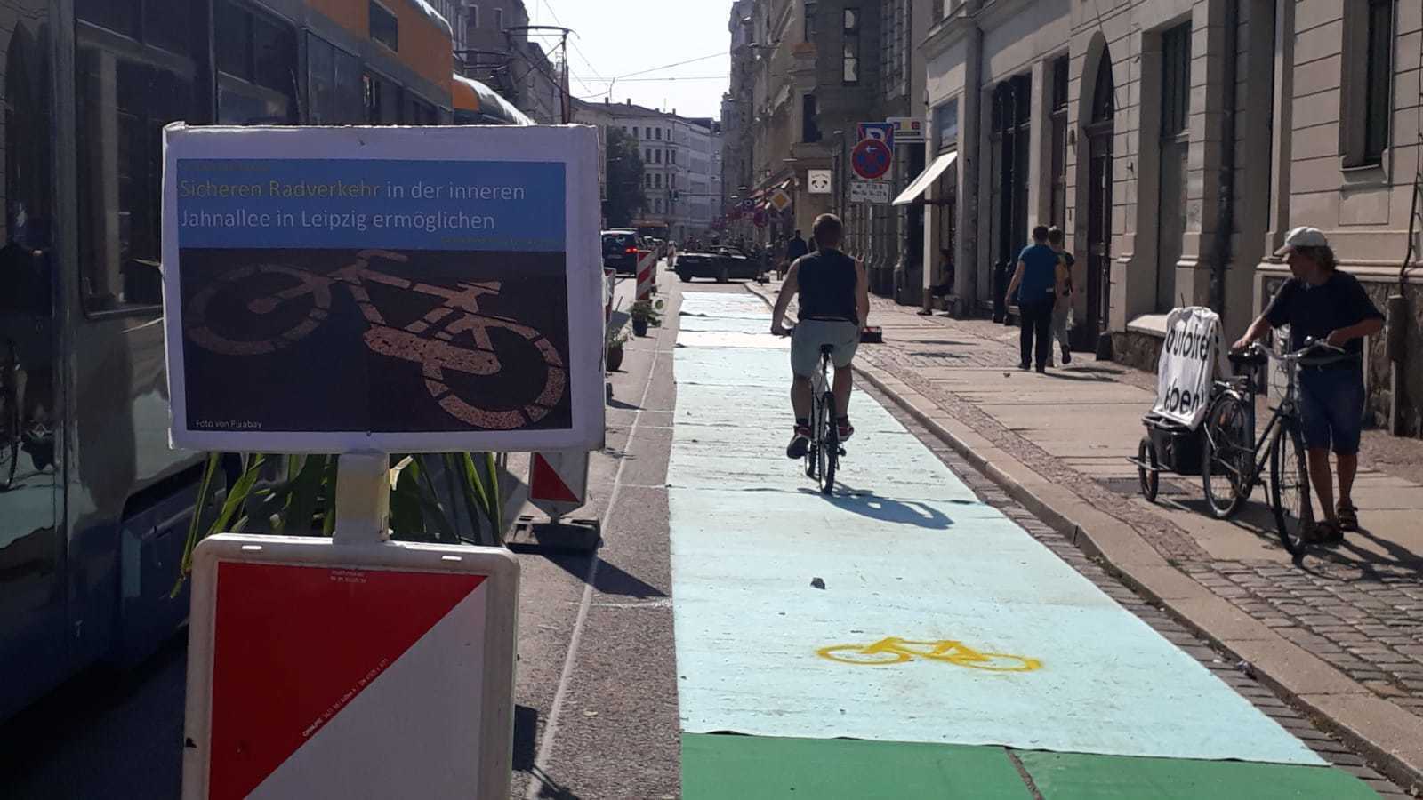 Auch die Politik unterstützt inzwischen das Anliegen der Petition und so ermöglicht am Samstag 18.8. ab 16Uhr die LINKE Leipzig sicheres Radfahren in der inneren Jahnallee.