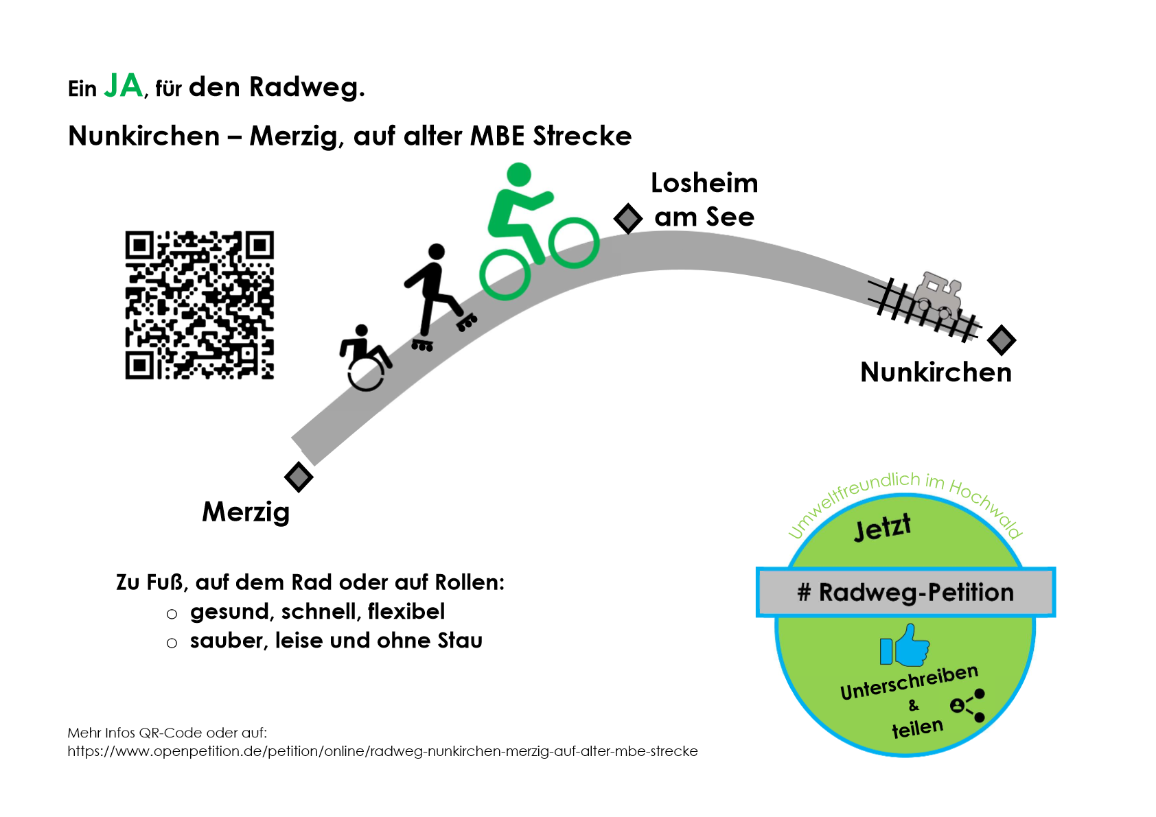 Aus touristischen und ökonomischen Gründen fordern wir anstelle eines Schienenverkers auf der aktuell nicht nutzbaren MBE Trasse eine Verlängerung des Geh- und Fahrradweges Nunkirchen - Niederlosheim bis nach Merzig. Bevor Geld für eine Reaktivierung des Schienenverkehrs in Form von S-Bahn, Güterverkehr oder MECL, oder für neue Radwege am Straßenrand zwischen Losheim und Bachem ausgegeben wird, stellen wir unsere Forderung zur Diskussion.