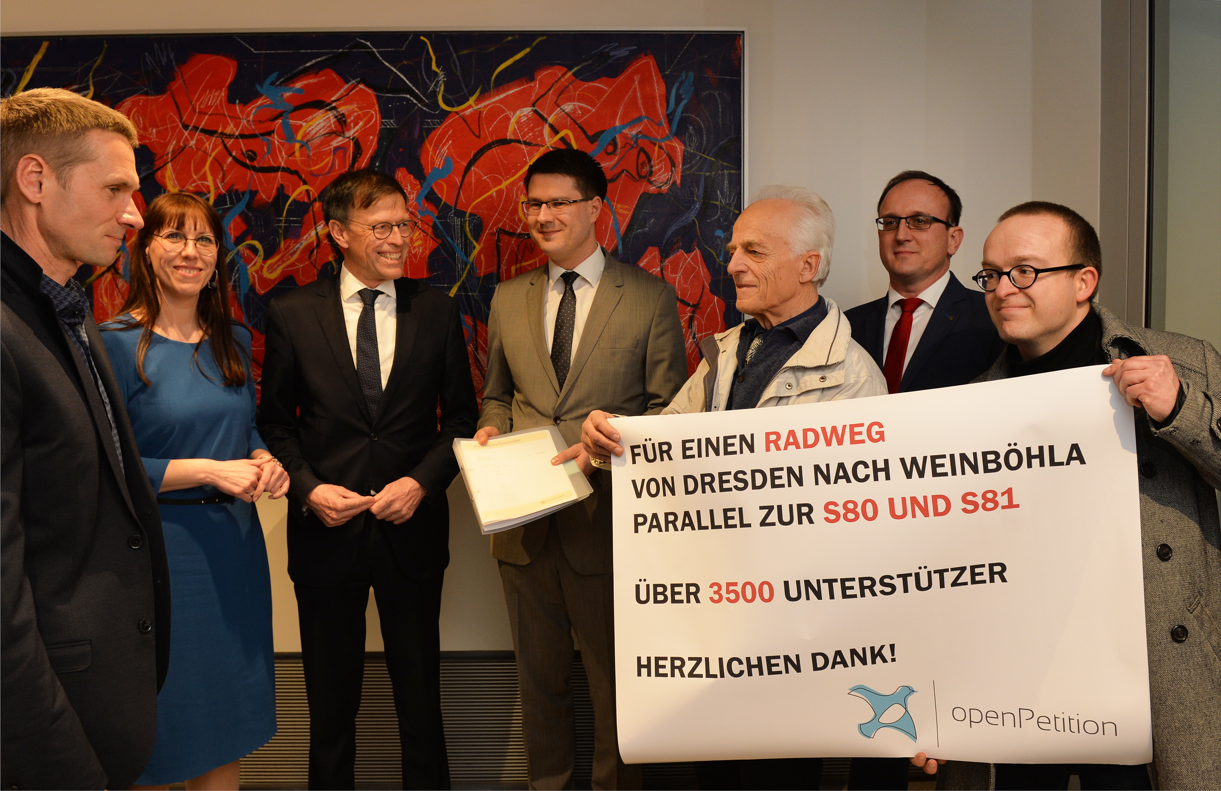 zur Information in unserer Sache. Am 13.03.2019 wurde die Petition mit Unterschriftenlisten an den Präsidenten des sächsischen Landtag, Herr Dr. M. Rößler, übergeben. Es waren sechs weitere Mitstreiter*innen sowie Mitglieder mehrerer Fraktionen anwesend. Engagierte Vertreter der Presse berichteten heute bereits in verschiedenen Medien mit Wort, Bild und Ton. Der Bevollmächtigte des Petitionsausschusses versprach, sich unserem Anliegen mit ganzem Eifer anzunehmen, was durchaus glaubhaft war. Mit einem Ergebnis des Verfahrens kann sicher erst in drei Monaten gerechnet werden. Bereits am 05.03.2019 fand ein Arbeitstreffen mit dem Minister für Wirtschaft und Verkehr in Sachsen, Herr Martin Dulig und den Bürgermeistern von Weinböhla und Moritzburg statt. Als Ergebnis wurde versprochen, noch in diesem Jahr mit ersten Vorplanungen für den gesamten Streckenabschnitt von Weinböhla bis Dresden zu beginnen, daran war noch vor wenigen Monaten nicht zu denken. Ich glaube wir können auf unseren Etappensieg sehr stolz sein und danke allen die dazu beigetragen haben.