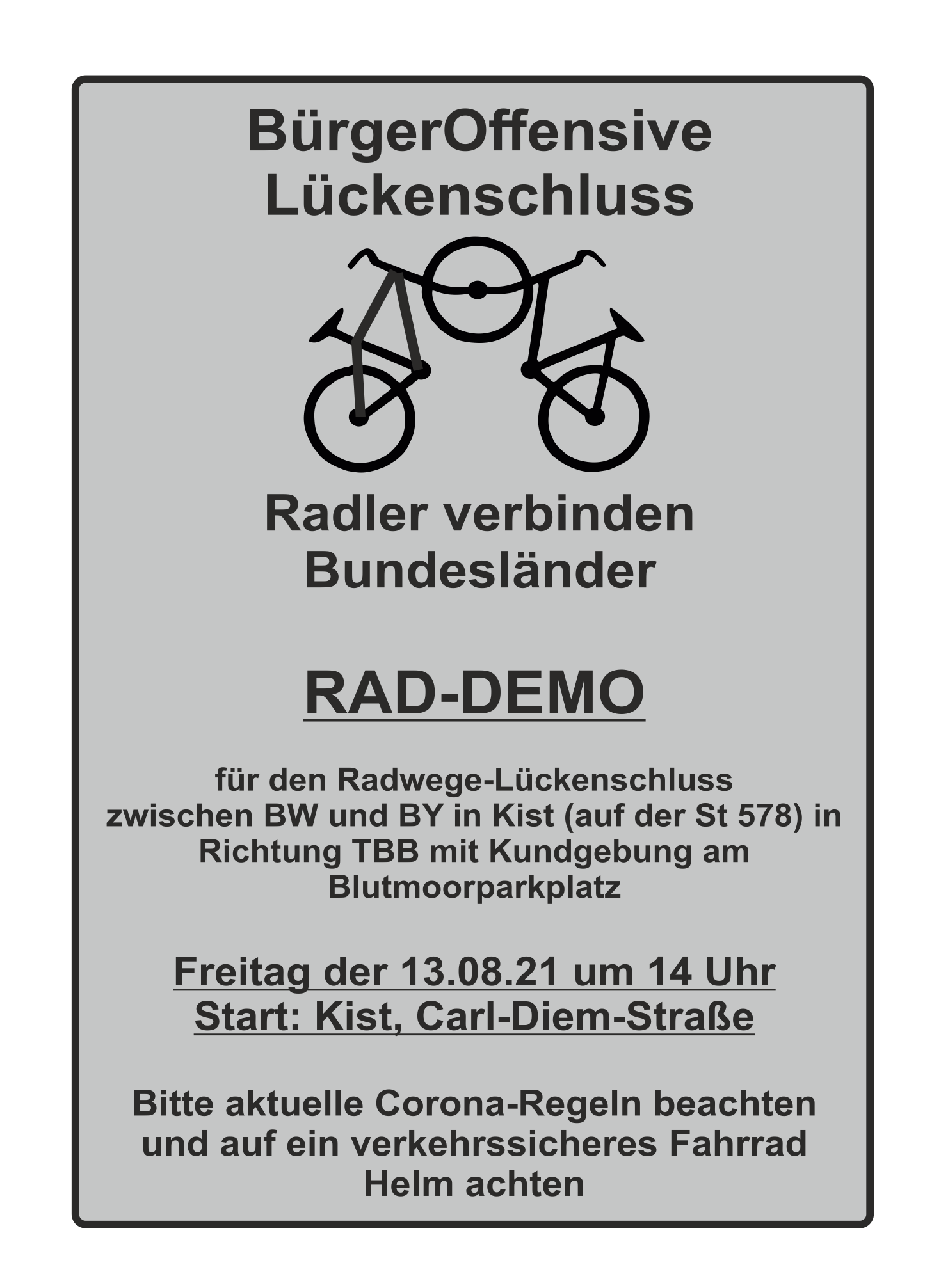 viel ist passiert und einiges ist erreicht. Heute möchten wir euch herzlich einladen zu unserer Fahrrad-Demonstration auf einem Teilstück der St 578, mit Kundgebung am Blutseeparkplatz und geordneter Rückfahrt nach Kist (Polizeischutz)