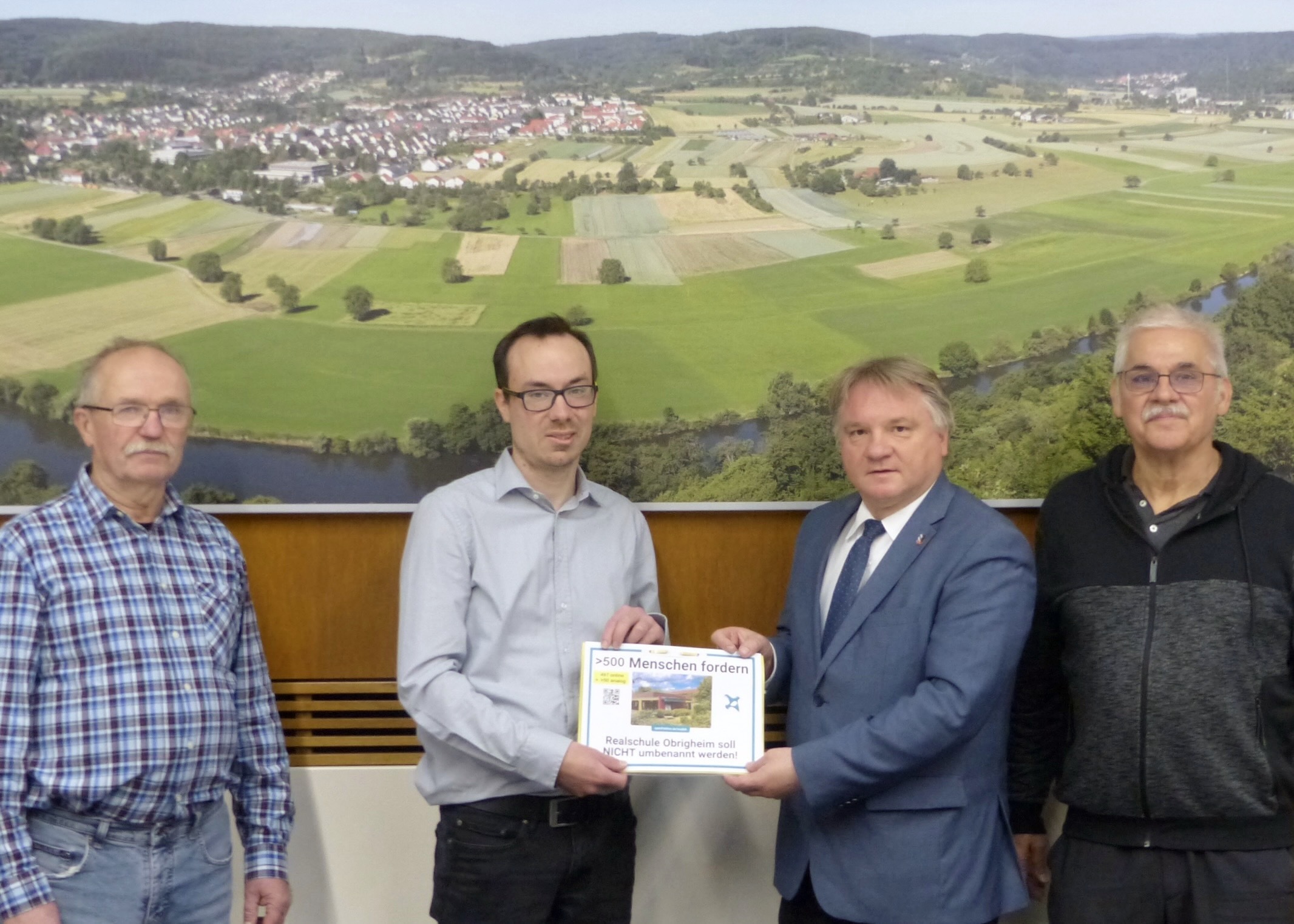 Zum Bild: Die Petition zum Erhalt des Namens der Realschule Obrigheim ist offiziell übergeben. V.l.: Gemeinderat Willi Horn, Mitinitiator Frank Heuß, Bürgermeister Achim Walter, Gemeinderat Stefan Mütz. Foto: Gemeinde Obrigheim