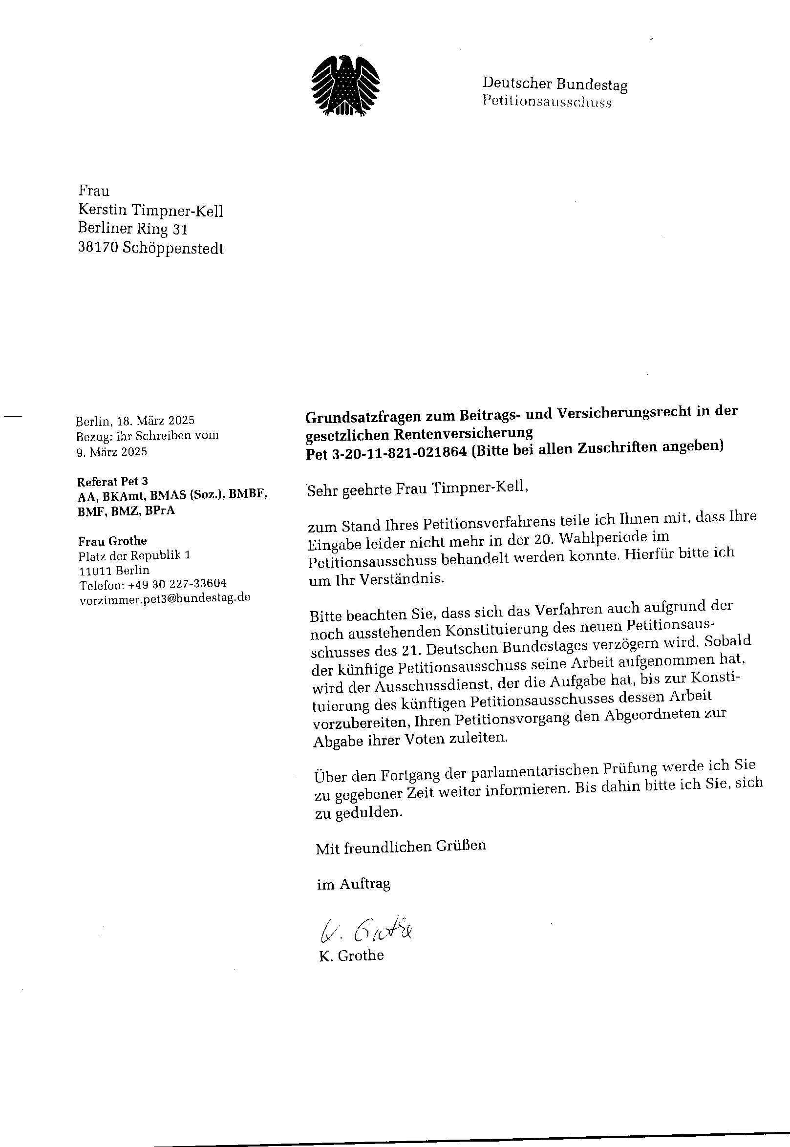 über unsere Petition hat die "alte" Bundesregierung nicht über unsere Petition zum Rentensystem entschieden. Inzwischen fand eine Bundestagswahl statt und eine neue Regierung wird das Land führen.
