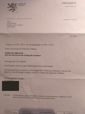 Die Petition befindet sich in der Prüfung beim Empfänger 16/12/2019, 11:29 π.μ. Die Petition befindet sich in der Prüfung beim Empfänger. Das Verfahren wird noch einige Zeit in Anspruch nehmen, siehe Anlage.