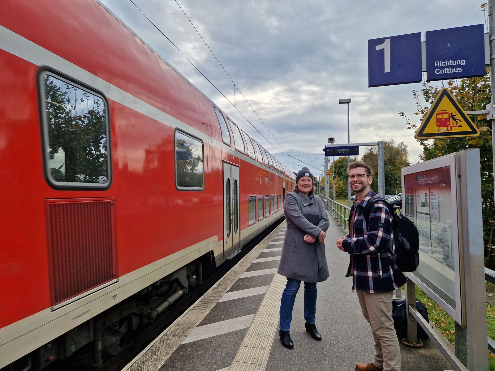 📸 Foto: Andrea Lübcke (MdB), v.l.n.r.: Andrea Lübcke und Samuel Neustupny, Bahnhof Bestensee