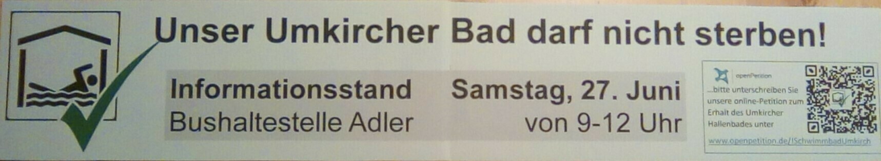 Um unser Anliegen bei der Gemeinde mit Gewicht vorzutragen, ist natürlich die Stimmung in der Gemeinde Umkirchs selbst zunächst das Wichtigste. Somit müssen wir die Informationen rund um die Schließung des Bades in Umkirch bekannt machen. Daher haben wir zur Streuung der Information und als "Werbung" für unsere online-Petition Banner an verschiedenen Stellen in Umkirch aufgehängt.