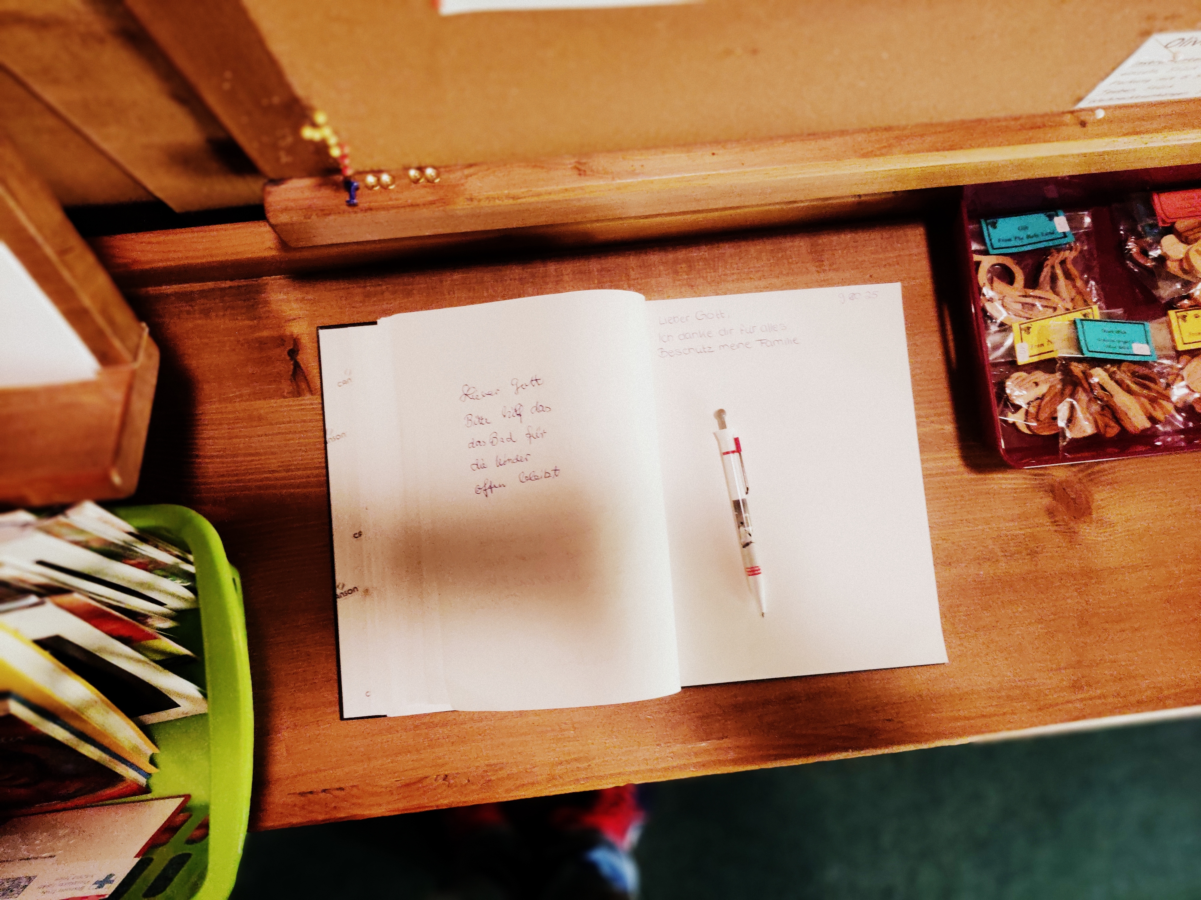 Im Fürbittenbuch können Besucher Wünsche, Sorgen oder Danksagungen für die Gottesdienstgemeinde festhalten. Es ist ein offenes Buch in der Kirche, in das Gläubige ihre Anliegen schreiben können, auch um in den Fürbitten der Messfeier genannt zu werden.