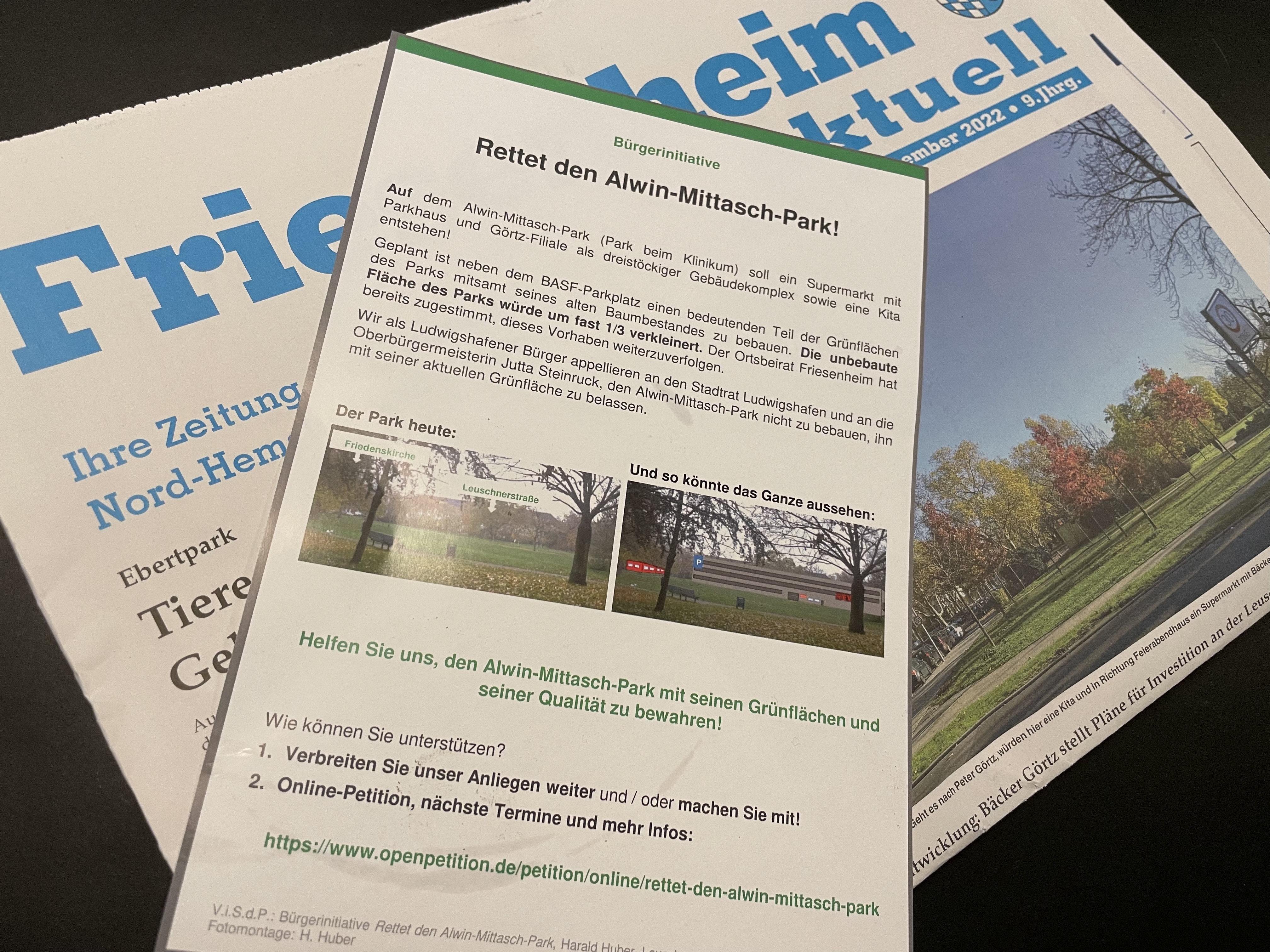 Wir als Friesenheimer und Ludwigshafener Bürger appellieren an den Stadtrat Ludwigshafen und an die Oberbürgermeisterin Jutta Steinruck, den Alwin-Mittasch-Park nicht zu bebauen und das Projekt in seiner bisher angedachten Form zu überdenken.