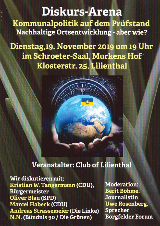 Dies ist eine seltene Gelegenheit, die Entscheider in Lilienthal direkt zu fragen, wie sie sich die Zukunft Lilienthals vorstellen und seine Meinung dazu zu äußern.