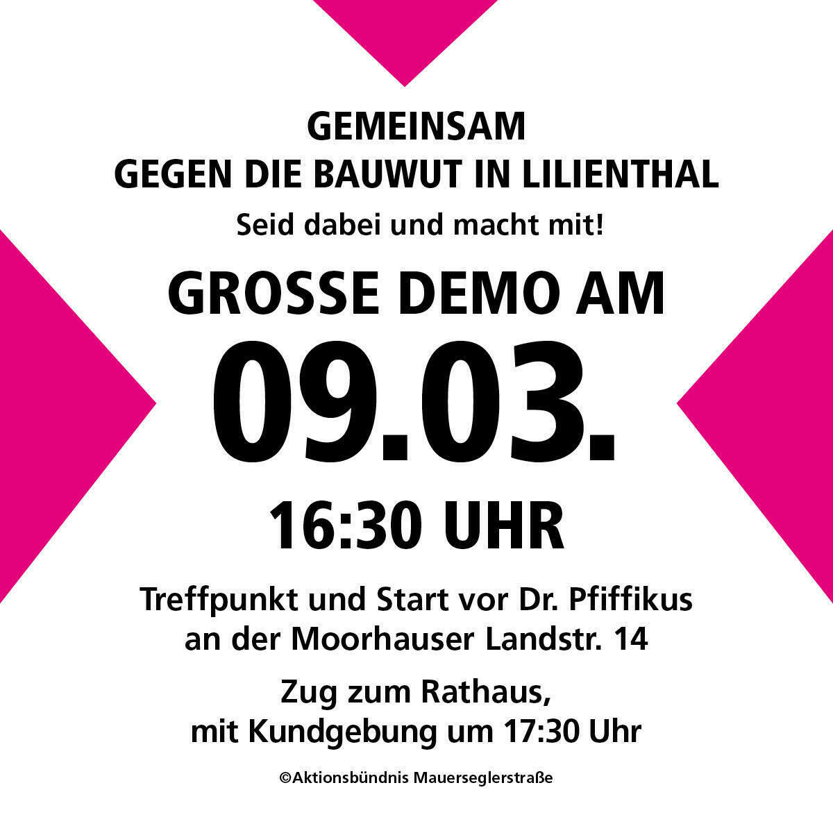 Dafür demonstriert Lilienthal am 09.03. Der Demonstrationszug sammelt sich um 16:30 Uhr an der Moorhauser Landstraße vor Dr. Pfiffikus und führt zum Rathaus.