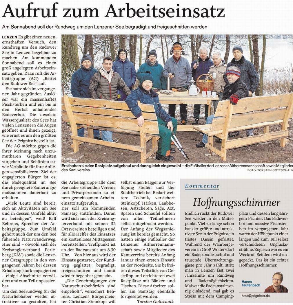 Der Prignitzer berichtete am 11.01.2017 unter der Überschrift "AG will den See schnell retten" und am 19.01.2017 veröffentlichte die MAZ einen Bericht mit der Überschrift "Baggern gegen Blaualgen".