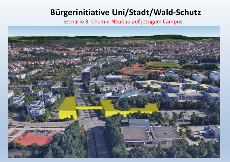 Vor allem die 3-D Darstellung hat verdeutlicht, dass es - städtebaulich auch durchaus attraktive - Möglichkeiten gibt, einen Neubau auf dem Campus zu errichten. Viele unserer Fragen wurden vom Stadtrat aufgegriffen und vor einer Beschlussfassung müssen unsere Vorschläge für Standorte auf dem Campus geprüft werden. Wir werden weiter dafür kämpfen, unseren Wald zu erhalten, wir sind der festen Überzeugung, dass der benötigte Chemiebau auch ohne Inanspruchnahme der Waldflächen zu realisieren ist.