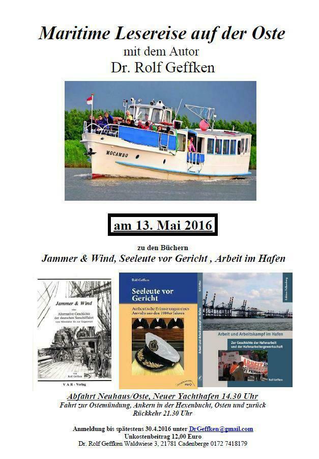 Wie geht es weiter ? Viele Fragen müssen geklärt werden. Eine der Fragen, die uns in Berlin bewegte, war zB: Woher kommt die Macht der Reeder, mit der sie ihre Forderungen so leicht durchsetzen können ? Und: Woran liegt es, daß die Öffentlichkeit so schwer zum Thema Seeschifffahrt und Seeleute zu mobilisieren ist ? Eine erste Gelegenheit zu gemeinsamer Diskussion bietet sich auf einer besonderen Veranstaltung, zu der ich alle UnterzeichnerInnen herzlich einlade. Dort wird Gelegenheit bestehen, in Diskussionen zu dreien meiner maritimen Bücher diese und andere Fragen zu vertiefen. Am 13. Mai lade ich zu einer "Maritimen Lesereise" mit dem Schiff "Mocambo" auf dem Fluß Oste ein. "Daneben" wird diese fast ganztägige "Reise" allen TeilnehmerInnen ausreichend Gelegenheit zur Erholung u n d zum gegenseitigen Kennenlernen bieten.