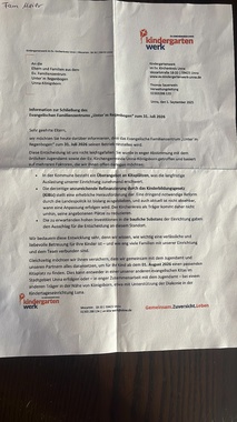 Unsere Kita soll zum 31.07.2026 geschlossen werden. Der Träger Ev. Kindergartenwerk des Ev. Kirchenkreises Unna möchte keine weiteren Gelder zur Sanierung in die KiTa investieren, ein lokales Überangebot reduzieren und eine re-Finanzierung des Landes gestaltet sich als Schwierig. Als Eltern möchten wir Unterschriften sammeln um diese dem Träger vorzulegen sowie auch den zuständigen Behörden um gegen die Schließung Wirkung zu zeigen.