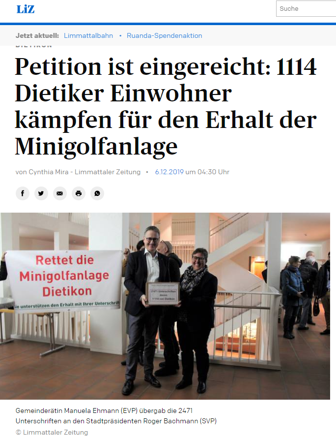 Wie Sie der Presse entnehmen können, wurde die unter kantonalem Denkmalschutz stehende Minigolfanlage Mühlematt von der Stadt Dietikon, mit finanzieller Unterstützung des Kantons, gekauft.