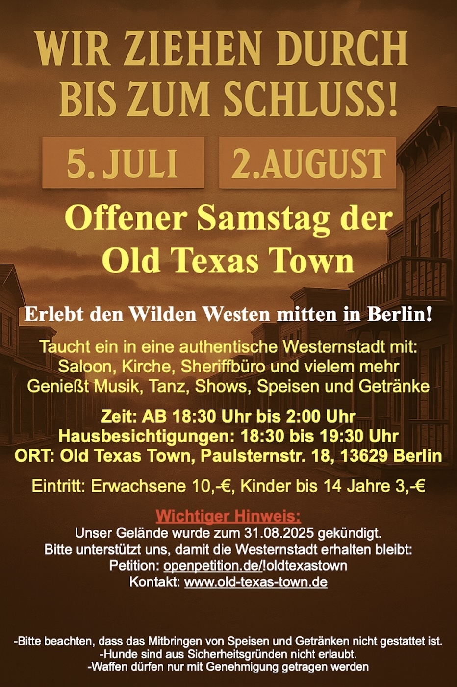 🔖 #OldTexasTown #BerlinSpandau #Westernstadt #WildwestBerlin #Petition #BerlinEvents #BerlinmitKindern #Kulturretten #BerlinErleben #Westernfans #OldWest #CowboyClub #Westernfreunde #Westernliebe #Berlin2025 #KulturBerlin #RettetOldTexasTown #GeisterstadtNeinDanke #BerlinVeranstaltungen