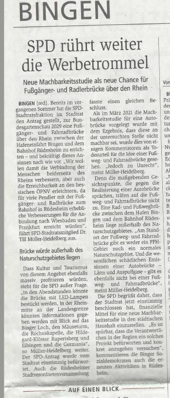 Rüdesheim und Bingen bringen Machbarkeitsstudie auf den Weg. Nachdem der Binger Stadtrat einstimmig Gelder für eine Machbarkeitsstudie freigegeben hat, ist am 7.10.21 in Rüdesheim in der Stadtverordnetenversammlung der Beschluß gefallen, sich finanziell an der Machbarkeitsstudie zu beteiligen. Ein kleiner Meilenstein - aber kein Grund sich zurück zu lehnen. Wir bleiben am Ball.