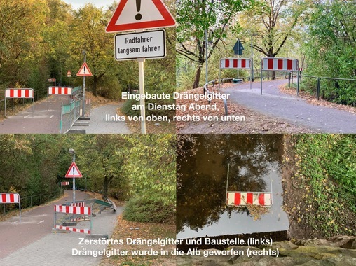 Allerdings wurde heute Nacht alles zerstört. Aufgestellte Absperrungen wurden umgeschmissen und die eingebaute Drängelgitter herausgerissen und in die Alb geworfen. Dies ist strafbarer Vandalismus den wir aufs Äußerste verurteilen. Mitarbeiter des Tiefbauamts waren heute morgen vor Ort und zurecht enttäuscht und verärgert, dies können wir gut nachvollziehen.