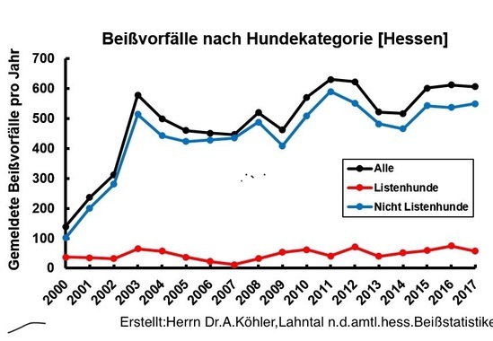 Nach Hinweisen einiger Besucher dieser Seite laden wir die Grafik der hessischen Beißstatistiken, erstellt von Dr.A. Köhler, nach eingehender Nachprüfung durch Heinz Baumann, übernommen in diese Petition. Die amtlichen hessischen Beißstatistiken sind leider nicht veröffentlicht, sondern können/müssen beim Hessischen Innenministerium angefordert werden. In dieser Statistik wird die „Gefahren-/Beißauffälligkeiten“ der Rassen, wie in dieser Statistik aufgeführt, beobachtet und kann gegenübergestellt werden. Weitere Ergebnisse zur Gefahren-/Beißauffälligkeiten können der jährlichen Statist entnommen werden. Dies beantwortet dann vielleicht einige Fragen der geneigten Leser dieser Petition.
