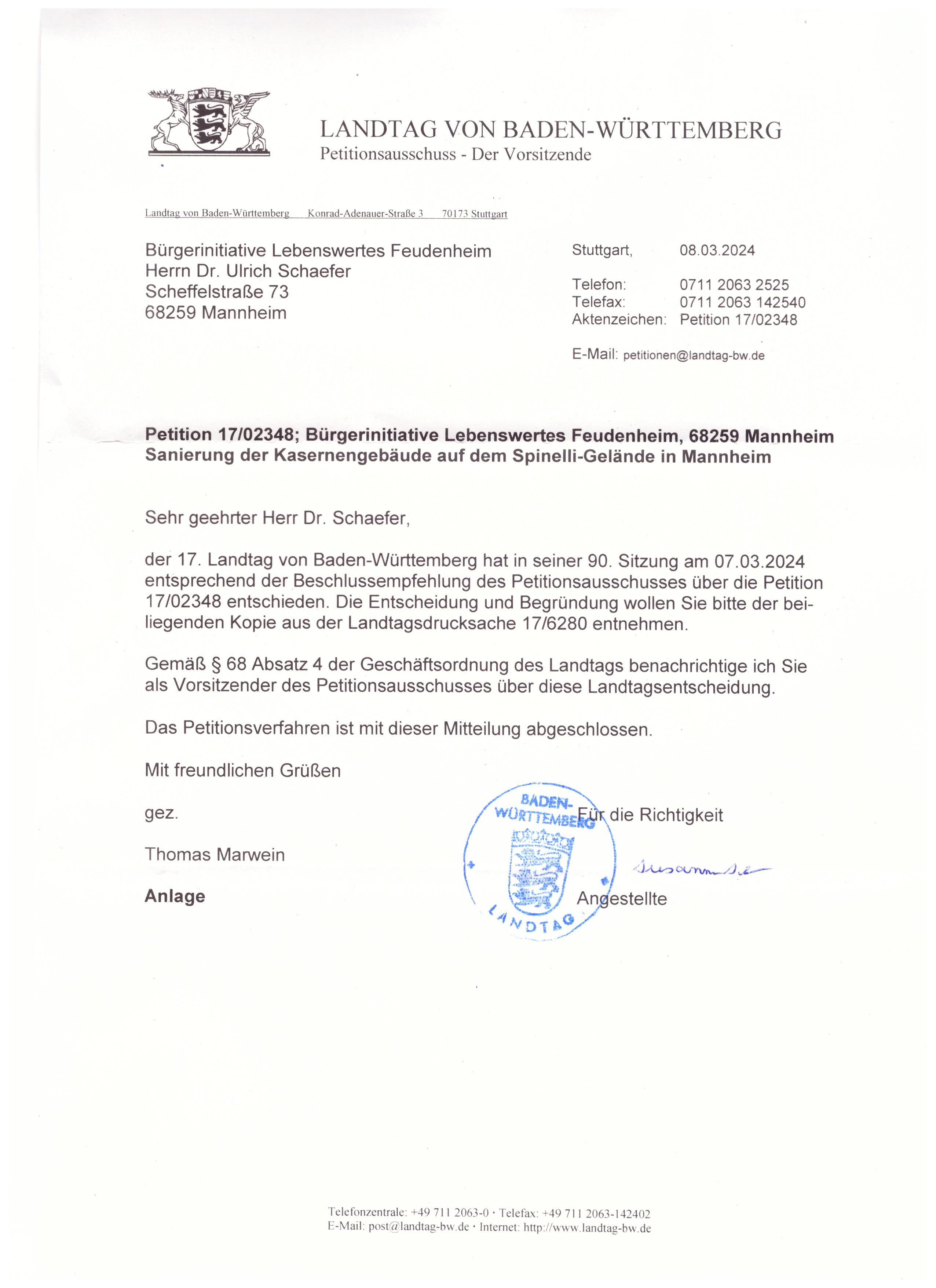 Da sie eine Petition eingereicht haben, hat das Petitionsbüro ihnen eine Eingangsbestätigung zugesandt. Ihre Petition ist nun im Geschäftsgang. Bis nun alle Informationen und Stellungnahmen eingegangen sind, wird es nun etwas dauern. Wann die oder der BerichterstatterIn die Petition abschließend bearbeitet hat und im Landtag verabschiedet wird, kann ich zeitlich nicht abschätzen.