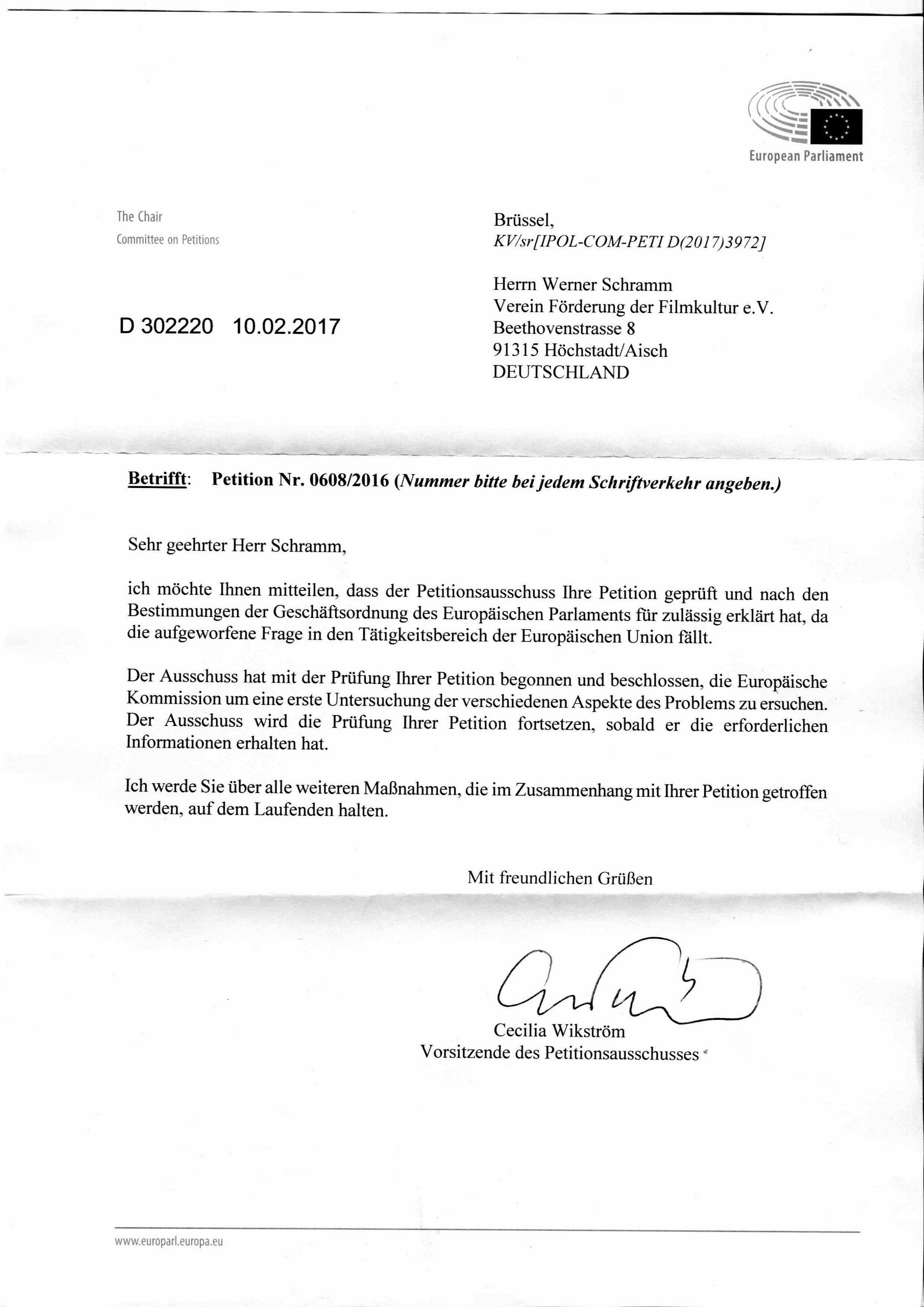 Die Petition wird sowohl an das EU-Parlament sowie an den Bundesverband der Filmverleiher VdF gemailt.