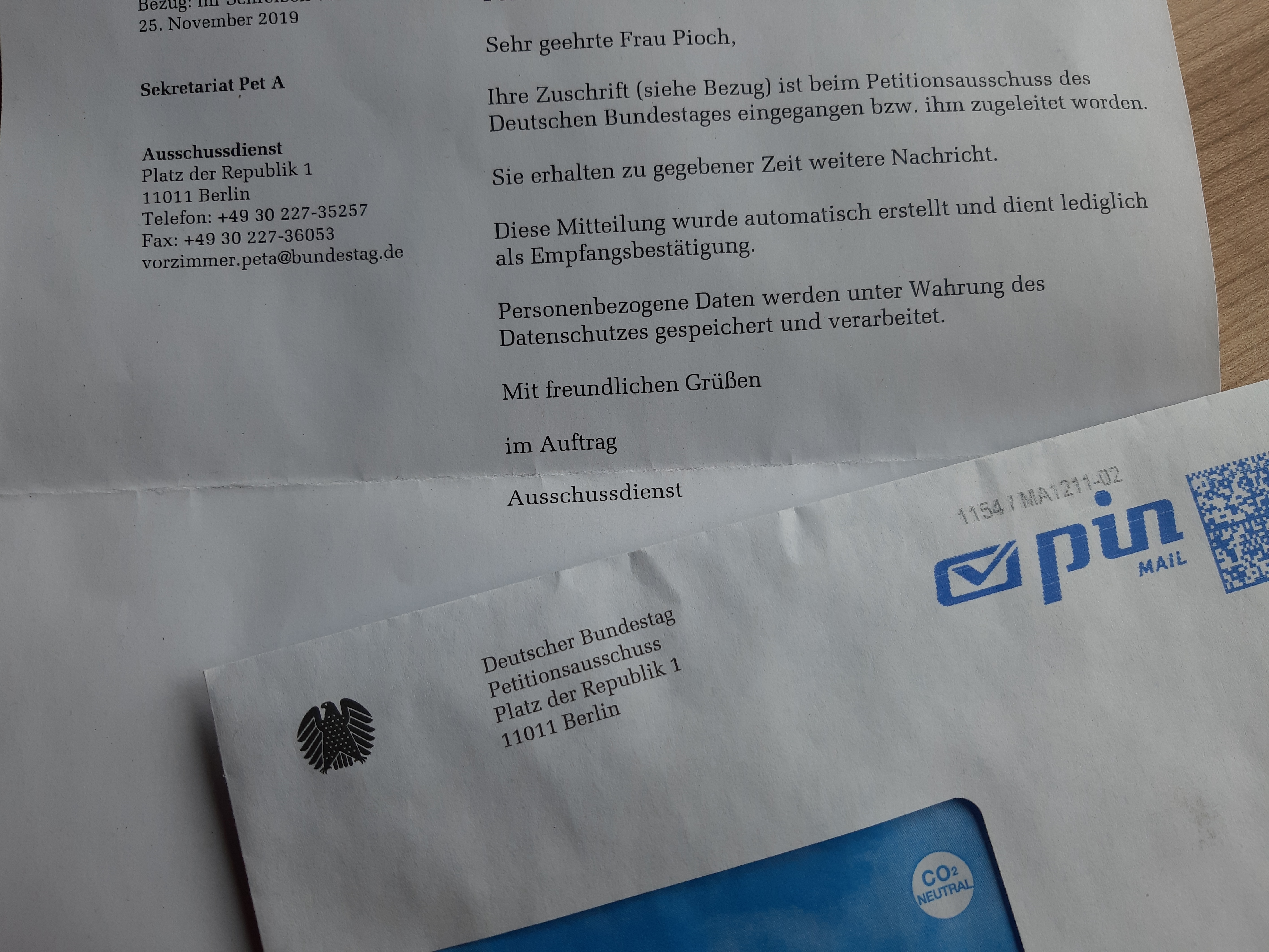 So sieht ein Brief aus Berlin aus... Na - eine Empfangsbestätigung. Angekommen ist zumindest schon einmal die elektronische Version. Die anderthalb Kilogramm Papier habe ich hinterher geschickt. Das dürfte inzwischen auch in Berlin sein...