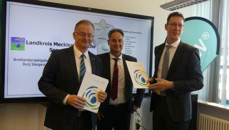 Der Landkreis Mecklenburgische Seenplatte hat heute einen weiteren Vertrag für den Breitbandausbau abgeschlossen. Landrat Heiko Kärger und der Geschäftsführer der neu-medianet GmbH, Olf Häusler, sowie neu-medianet- Prokurist Sören Schmidt unterzeichneten in Neubrandenburg den Vertrag für das Breitband-Projektgebiet MSE 24_25.