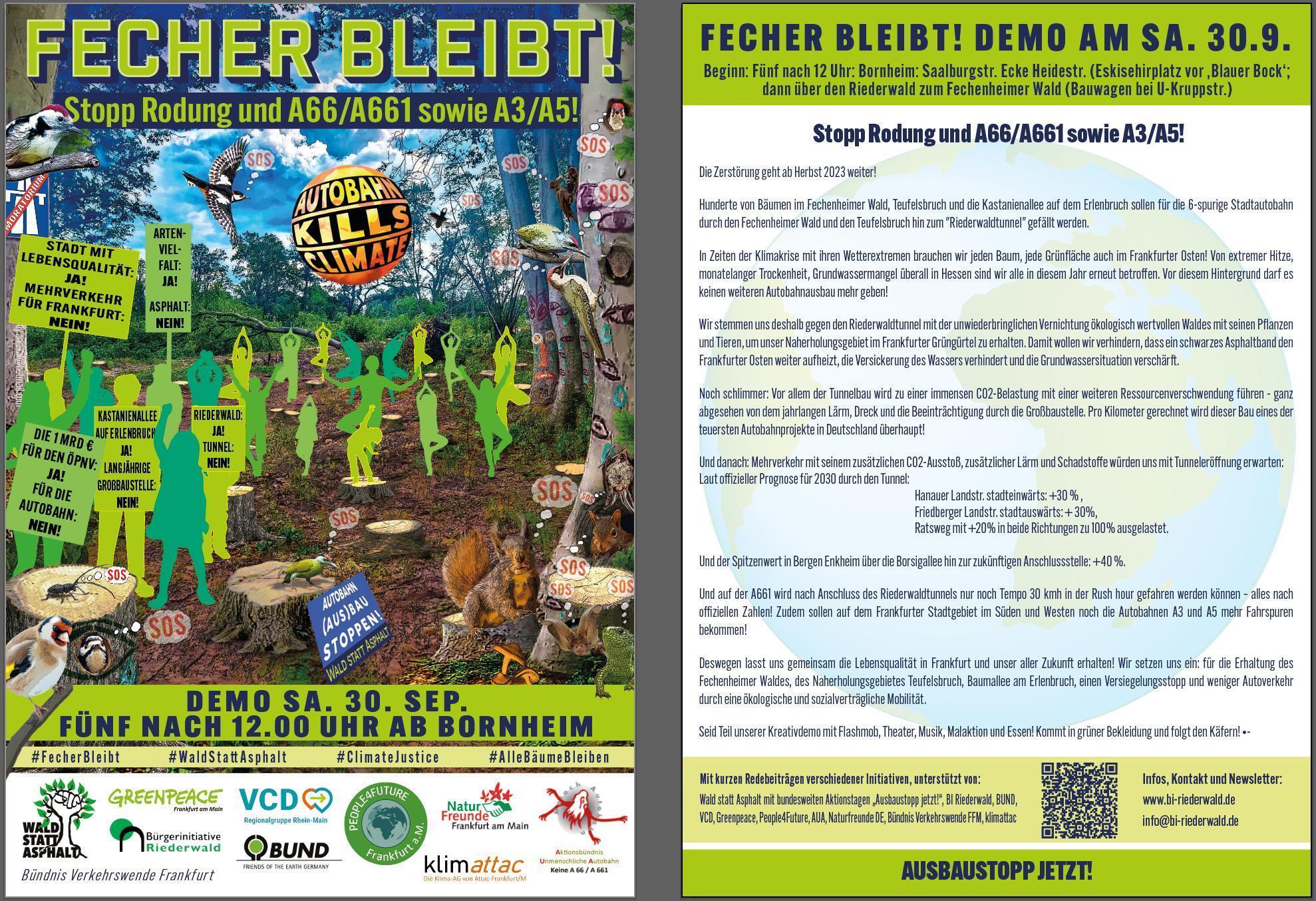 Ein breites Bündnis von Organisationen und Initiativen, darunter auch das Aktionsbündnis Unmenschliche Autobahn sowie das Bündnis Verkehrswende Frankfurt ruft gemeinsam am 8.10.22 um 14 Uhr unter dem Motto "Wald schützen, Klima retten! #FecherBleibt - keine A66! Stoppt den Autobahn(aus)bau in & um Frankfurt!" zu einer großen Demonstration auf. Ziel ist der Fechenheimer Wald. Wichtigstes Ziel ist ein Moratorium für die noch diese Herbst/Winter-Periode 2022/2023 vorgesehene Rodung aller Bäume im Fechenheimer Wald, Teufelsbruch und Erlenbruch zwischen Hessen-Center und Gleisdreieck Erlenbruch.
