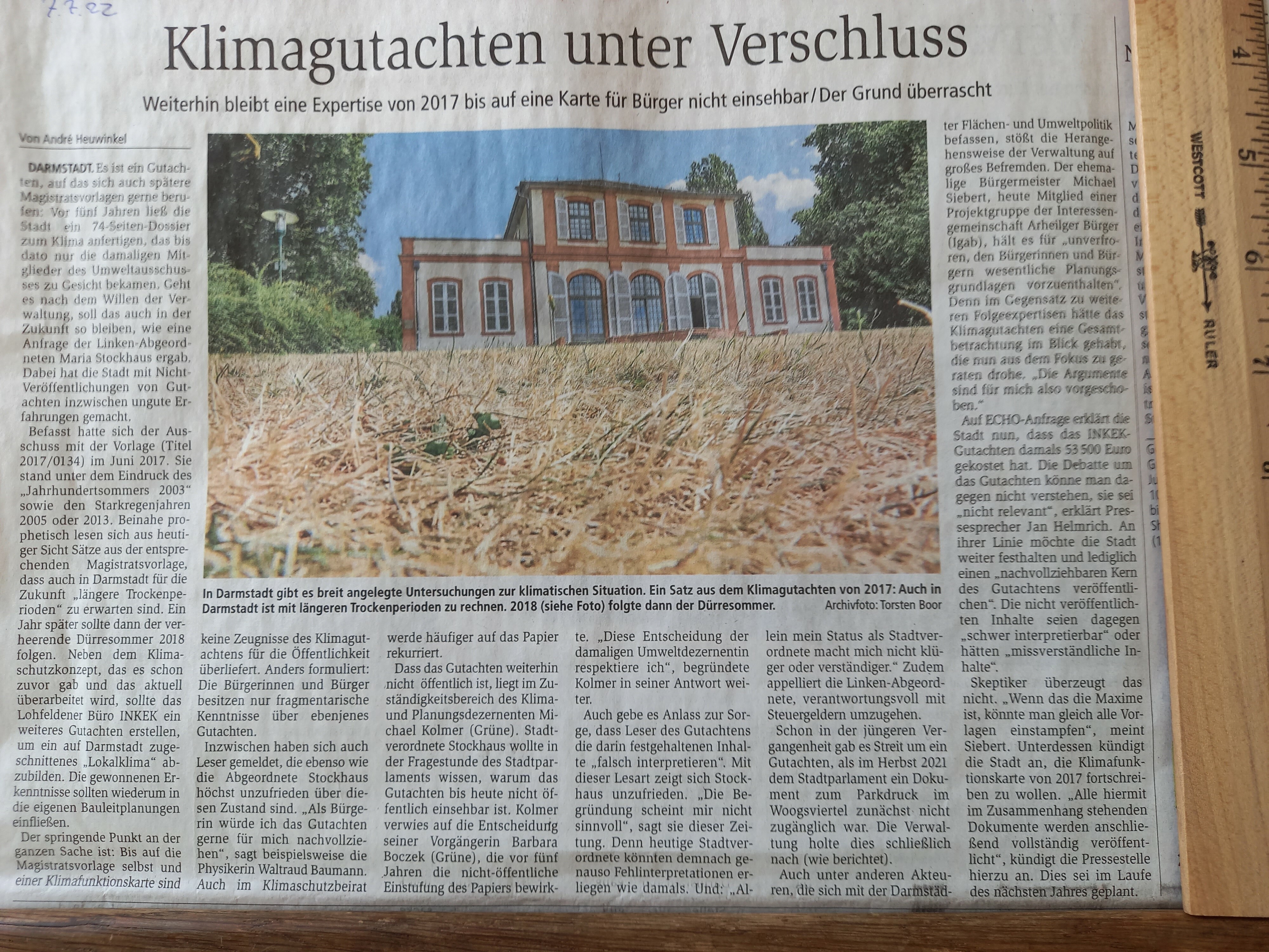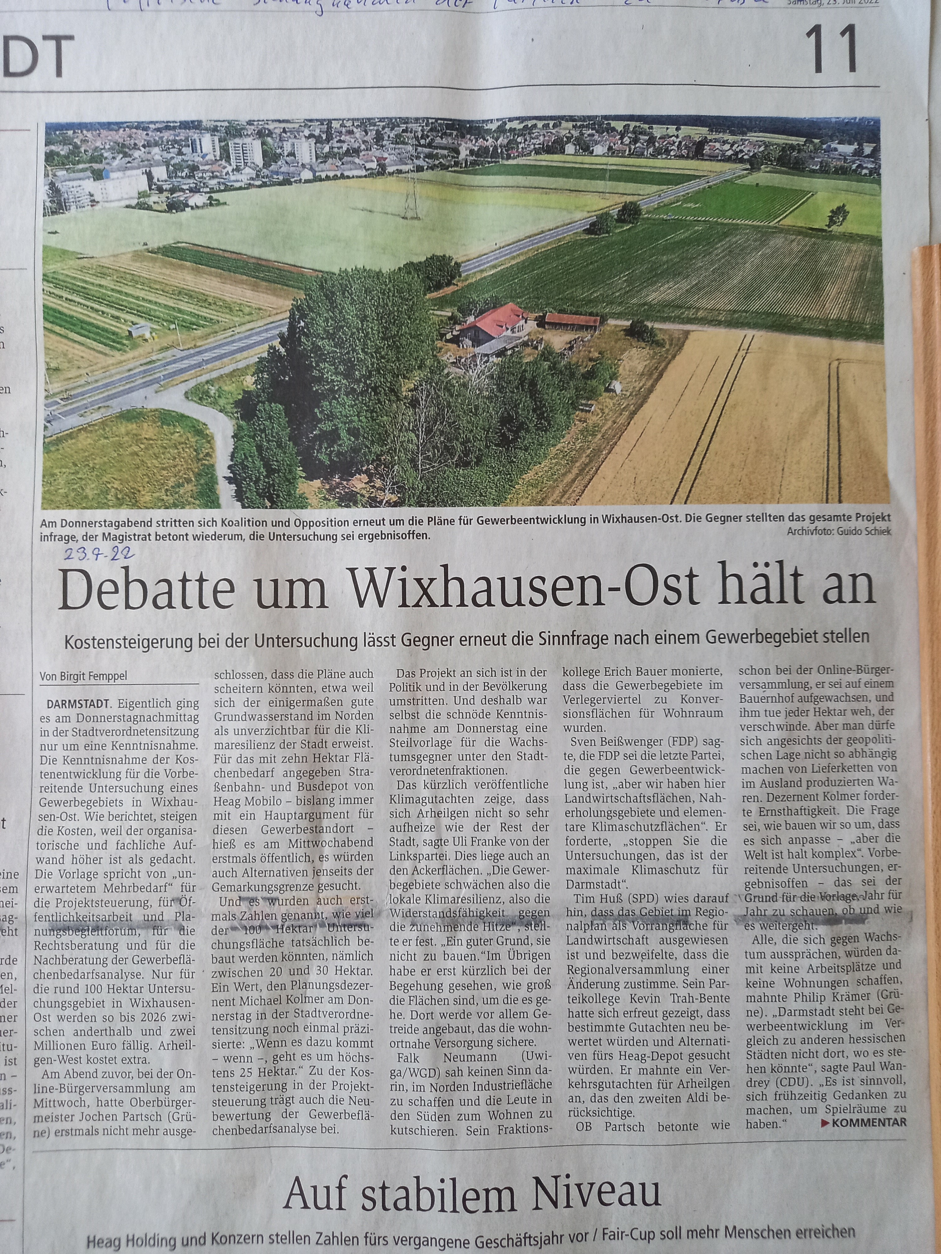 Der Artikel berichtet von der Stadtverordnetenversammlung am Donnerstag 21.7.22. Anlass war eine Kostensteigerung von bisher genehmigten ca 400 000€ auf nunmehr etwa 2MIO Euro zur weiteren Durchführung der vorbereitenden Untersuchungen. Diese musste dem Darmstädter Parlament zwecks Genehmigung vorgelegt werden. Dies wiederum war Anlass zu mehreren Redebeiträgen der Parteirepräsentanten zur Sinnhaftigkeit der Voruntersuchungen. Auszüge sind im Artikel zu lesen. Besonders interessant, da der OB Kandidat der CDU erstmals ein Statement abgab.Initiiert von dieser Petition wurden alle Stadtverordneten zu einer Stellungnahme gebeten.