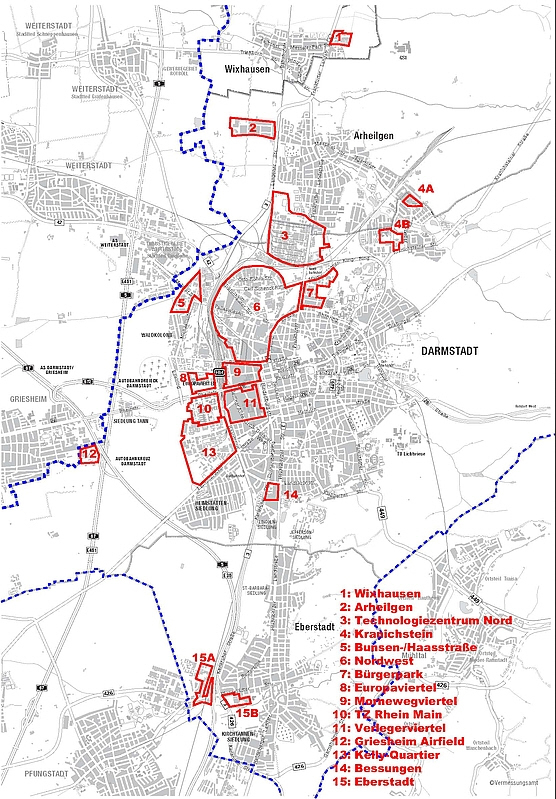 DieOn Stadtverordnetenversammlungthe hatbasis aufof derthe Grundlagewell-known desMaster bekanntenPlan Masterplanes2030+, 2030+the cacity 230hacouncil has designated around 230 hectares in den Gemarkungenthe Arheilgen West undand Wixhausen OstEast alsdistricts prioritäreas Gewerbeflächepriority ausgewiesen.commercial areas.