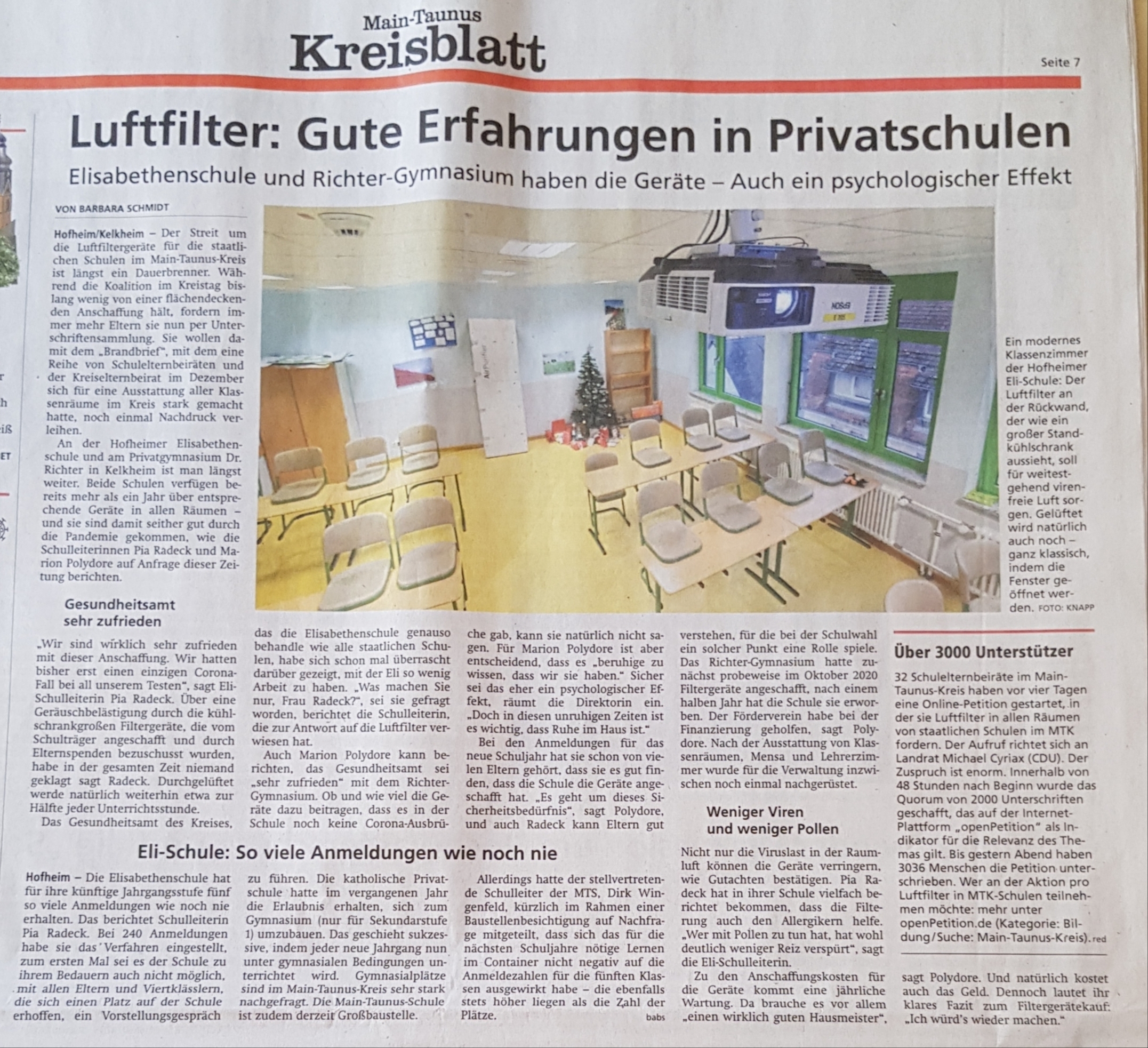 Der Kreistag hat im laufenden Haushalt 3 Millionen Euro für Luftfiltergeräte eingeplant. Zusätzlich hat der Main-Taunus-Kreis vom Land Hessen 4,7 Millionen Euro für Hygienemaßnahmen an den Schulen überwiesen bekommen. Die Gelder dafür sind also verfügbar.