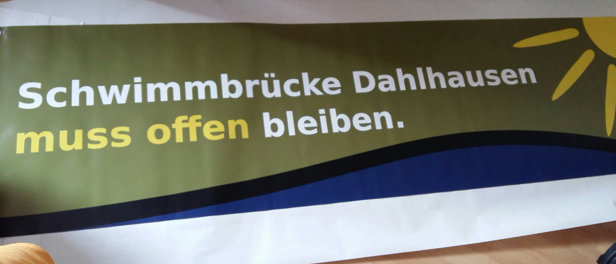 Alle Bürgerinnen und Bürger sind eingeladen, sich an der Kundgebung mit ihrer Anwesenheit zu beteiligen. Der Aufkleber "Schwimmbrücke Dahlhausen muss offen bleiben" wurde hierfür auf 2 Meter Größe gebracht (siehe Bild).