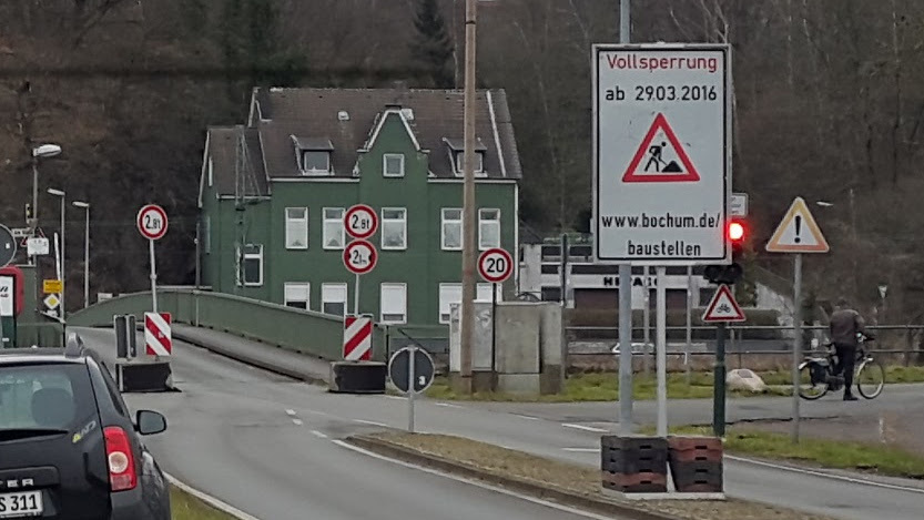 Ostermontag wird die Schwimmbrücke in Dahlhausen von der Stadt Bochum gesperrt. Darauf weist die Stadtverwaltung seit einigen Wochen mit einem Schild vor der Brücke hin. Lange Umwege sind dann zwischen den Ort Bochum-Dahlhausen und -Linden, Essen-Burgaltendorf und Hattingen-Niederwenigern notwendig. Die Stadt Bochum begründet die Sperrung mit den notwendigen Bauarbeiten auf der Lewackerstraße, die bis März 2017 dauern sollen. Ob die Brücke überhaupt wieder geöffnet wird soll nach den Sommerferien 2016 entschieden werden.