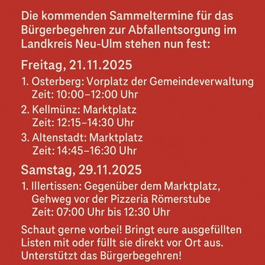 Im Landkreis Neu-Ulm hat Initiator Manuel Korn(SPD) ein Bürgerbegehren zur zukünftigen Organisation der Abfallentsorgung ins Leben gerufen. Ziel ist es, den Bürgerinnen und Bürgern des Landkreises die Möglichkeit zu geben, aktiv über die künftige Ausgestaltung der Müllentsorgung mitzuentscheiden.