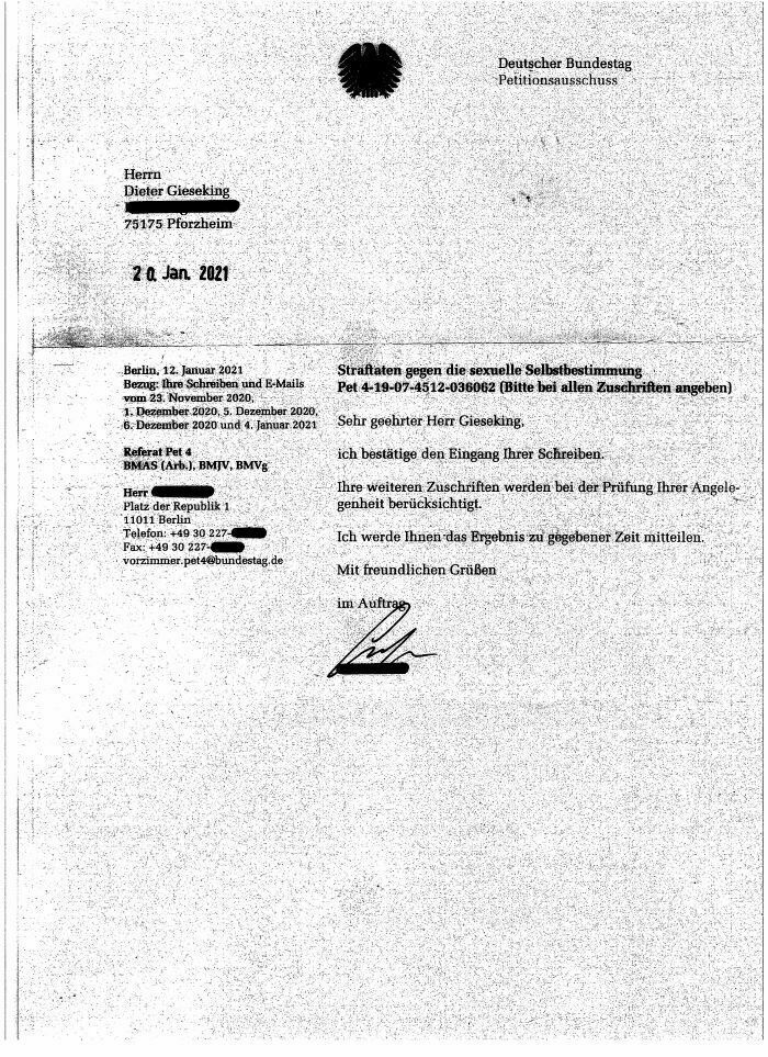 Der Petitionsausschuss hat erneut mit einem Schreiben reagiert. Darin werden die Eingänge der Ergänzungen & Newsletter an alle Mitglieder des Ausschusses bestätigt.