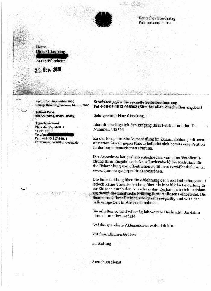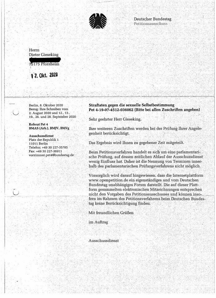 Der Petitionsausschuss hat erneut reagiert und das Schreiben liegt bei bzw. wird bei openPetition als Dokument bereit gestellt. Es gibt ein neues Aktenzeichen!!!