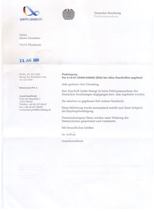 Der Petitionsausschuss des Deutschen Bundestages hat die Online-Einreichung der Petition auf dem üblichen Postwege bestätigt. Das Schreiben mit der Pet 4-19-07-99999-036062 liegt in der Anlage als JPG-Datei bei. Inzwischen haben 21 Personen die Petition mit gezeichnet. Weitere Informationen können meinen Webseiten entnommen werden.