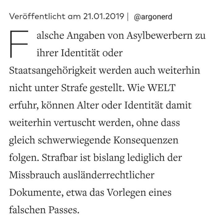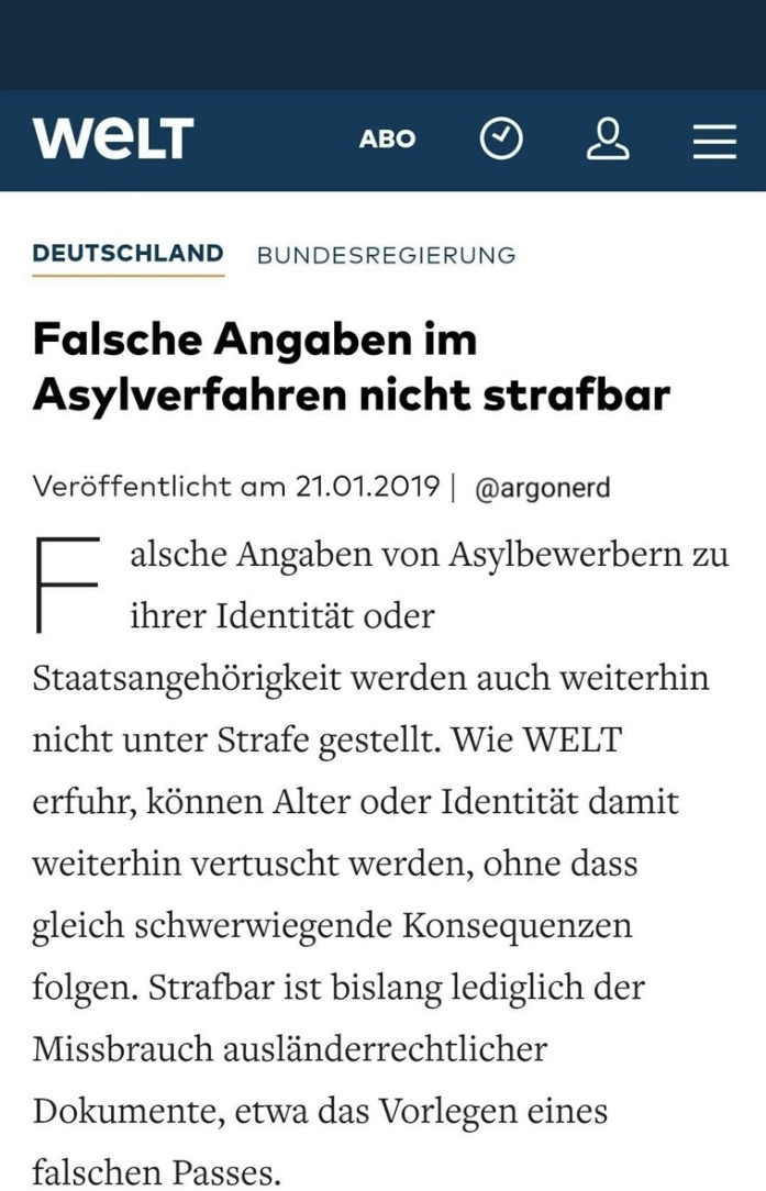 Strafbar ist bislang lediglich der Missbrauch ausländerrechtlicher Dokumente, etwa das Vorlegen eines falschen Passes. Eine nicht korrekte Angabe des eigenen Alters ist nicht strafbar.